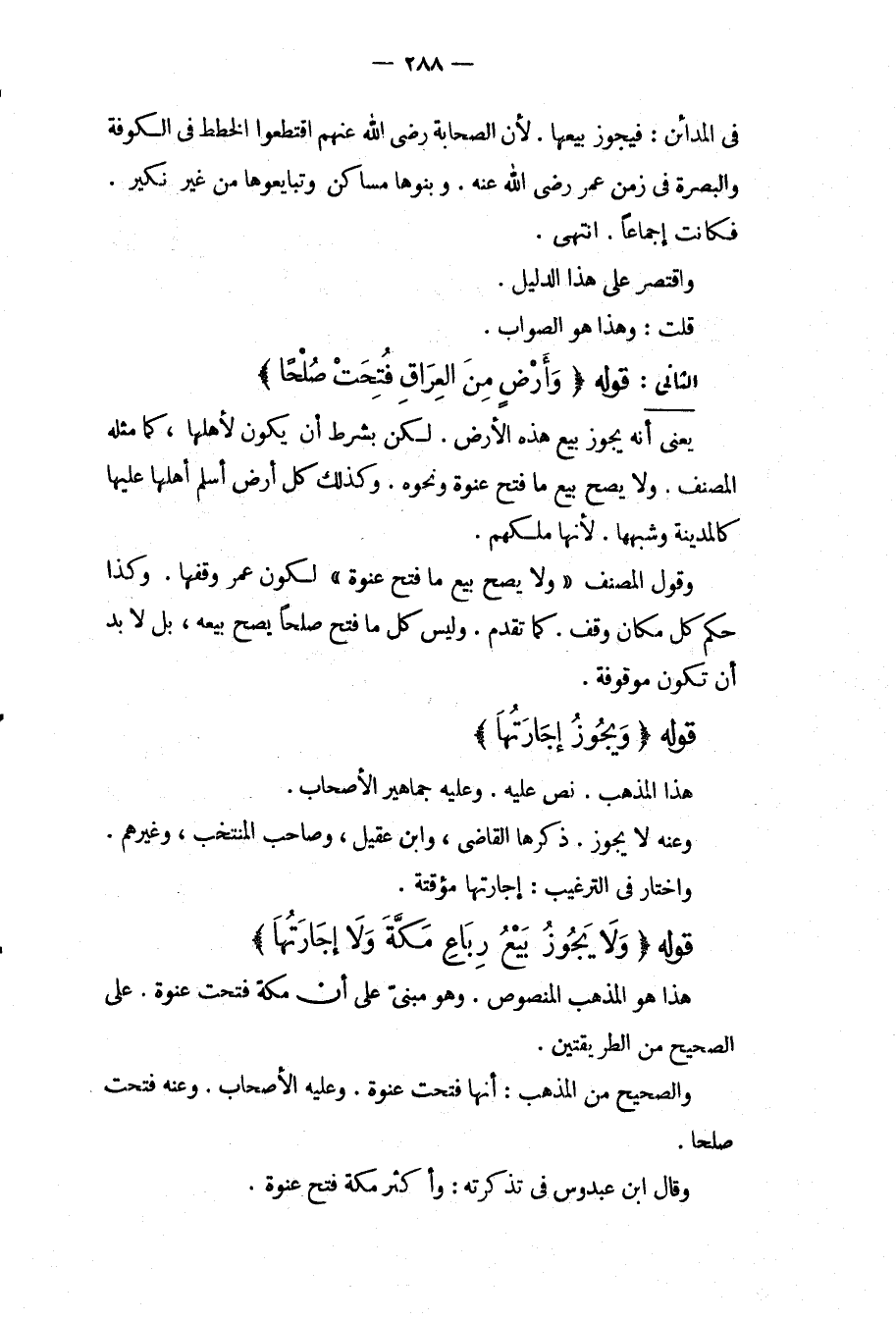 الثَّانِي: قَوْلُهُ (وَأَرْضٍ مِنْ الْعِرَاقِ فُتِحَتْ صُلْحًا) يَعْنِي أَنَّهُ يَجُوزُ بَيْعُ هَذِهِ الْأَرْضِ. لَكِنْ بِشَرْطِ أَنْ يَكُونَ لِأَهْلِهَا، كَمَا مَثَّلَهُ الْمُصَنِّفُ. وَلَا يَصِحُّ بَيْعُ مَا فُتِحَ عَنْوَةً وَنَحْوُهُ. وَكَذَلِكَ كُلُّ أَرْضٍ أَسْلَمَ أَهْلُهَا عَلَيْهَا كَالْمَدِينَةِ وَشِبْهِهَا. لِأَنَّهَا مِلْكُهُمْ. وَقَوْلُ الْمُصَنِّفِ " وَلَا يَصِحُّ بَيْعُ مَا فُتِحَ عَنْوَةً " لِكَوْنِ عُمَرَ وَقَفَهَا. وَكَذَا حُكْمُ كُلِّ مَكَان وُقِفَ. كَمَا تَقَدَّمَ. وَلَيْسَ كُلُّ مَا فُتِحَ صُلْحًا يَصِحُّ بَيْعُهُ، بَلْ لَا بُدَّ أَنْ تَكُونَ مَوْقُوفَةً.