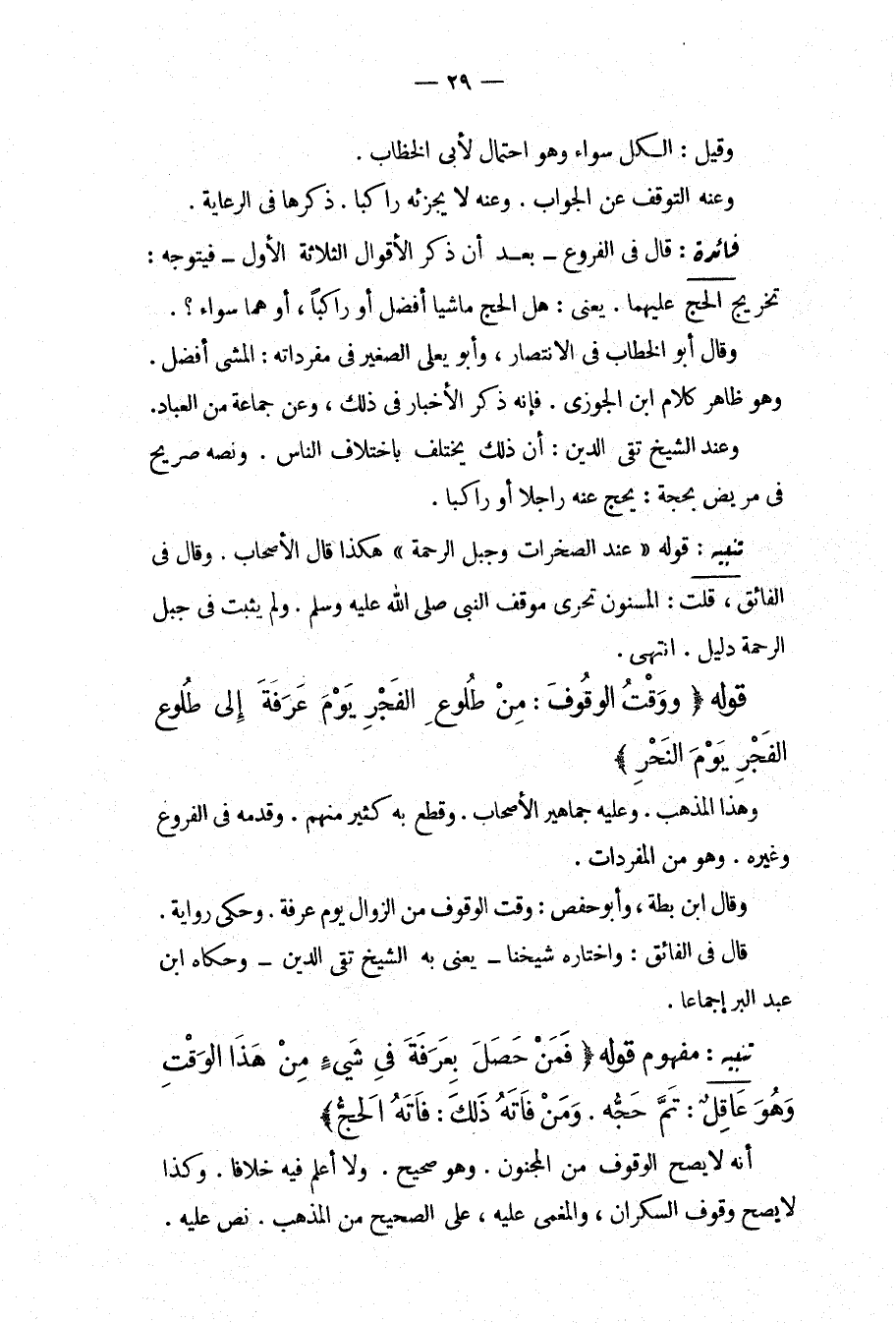 قَوْلُهُ (وَوَقَّتَ الْوُقُوفَ: مِنْ طُلُوعِ الْفَجْرِ يَوْمَ عَرَفَةَ إلَى طُلُوعِ الْفَجْرِ يَوْمَ النَّحْرِ) وَهَذَا الْمَذْهَبُ وَعَلَيْهِ جَمَاهِيرُ الْأَصْحَابِ وَقَطَعَ بِهِ كَثِيرٌ مِنْهُمْ وَقَدَّمَهُ فِي الْفُرُوعِ وَغَيْرِهِ وَهُوَ مِنْ الْمُفْرَدَاتِ وَقَالَ ابْنُ بَطَّةَ، وَأَبُو حَفْصٍ: وَقَّتَ الْوُقُوفَ مِنْ الزَّوَالِ يَوْمَ عَرَفَةَ وَحَكَى رِوَايَةً، قَالَ فِي الْفَائِقِ: وَاخْتَارَهُ شَيْخُنَا يَعْنِي بِهِ الشَّيْخَ تَقِيَّ الدِّينِ وَحَكَاهُ ابْنُ عَبْدِ الْبَرِّ إجْمَاعًا تَنْبِيهٌ: