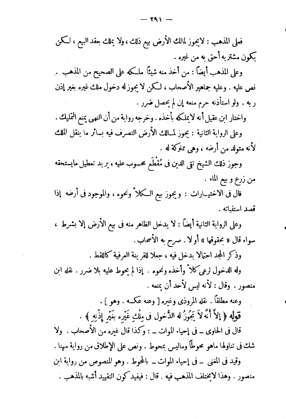 فَعَلَى الْمَذْهَبِ: لَا يَجُوزُ لِمَالِكِ الْأَرْضِ بَيْعُ ذَلِكَ، وَلَا يَمْلِكُ بِعَقْدِ الْبَيْعِ، لَكِنْ يَكُونُ مُشْتَرِيهِ أَحَقَّ بِهِ مِنْ غَيْرِهِ. وَعَلَى الْمَذْهَبِ أَيْضًا: مَنْ أَخَذَ مِنْهُ شَيْئًا مَلَكَهُ عَلَى الصَّحِيحِ مِنْ الْمَذْهَبِ. نَصَّ عَلَيْهِ. وَعَلَيْهِ جَمَاهِيرُ الْأَصْحَابِ، لَكِنْ لَا يَجُوزُ لَهُ دُخُولُ مِلْكِ غَيْرِهِ بِغَيْرِ إذْنِ رَبِّهِ. وَلَوْ اسْتَأْذَنَهُ حَرُمَ مَنْعُهُ إنْ لَمْ يَحْصُلْ ضَرَرٌ. وَاخْتَارَ ابْنُ عَقِيلٍ أَنَّهُ لَا يَمْلِكُهُ بِأَخْذِهِ. وَخَرَّجَهُ رِوَايَةً مِنْ أَنَّ النَّهْيَ يَمْنَعُ التَّمْلِيكَ. وَعَلَى