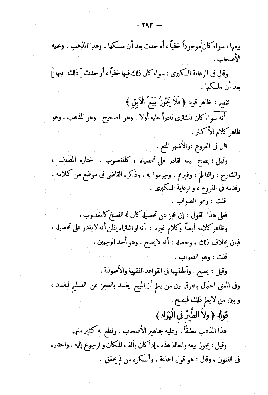 قَوْلُهُ (وَلَا الطَّيْرِ فِي الْهَوَاءِ) هَذَا الْمَذْهَبُ مُطْلَقًا. وَعَلَيْهِ جَمَاهِيرُ الْأَصْحَابِ. وَقَطَعَ بِهِ كَثِيرٌ مِنْهُمْ. وَقِيلَ: يَجُوزُ بَيْعُهُ وَالْحَالَةُ هَذِهِ، إذَا كَانَ يَأْلَفُ الْمَكَانَ وَالرُّجُوعَ إلَيْهِ. وَاخْتَارَهُ فِي الْفُنُونِ، وَقَالَ: وَهُوَ قَوْلُ الْجَمَاعَةِ. وَأَنْكَرَهُ مَنْ لَمْ يُحَقِّقْ.