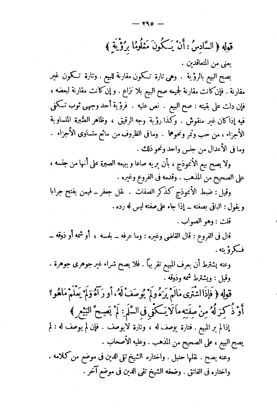 قَوْلُهُ (السَّادِسُ: أَنْ يَكُونَ مَعْلُومًا بِرُؤْيَةٍ) يَعْنِي مِنْ الْمُتَعَاقِدَيْنِ. يَصِحُّ الْبَيْعُ بِالرُّؤْيَةِ. وَهِيَ تَارَةً تَكُونُ مُقَارِنَةً لِلْبَيْعِ. وَتَارَةً تَكُونُ غَيْرَ مُقَارِنَةٍ. فَإِنْ كَانَتْ مُقَارِنَةً لِجَمِيعِهِ صَحَّ الْبَيْعُ بِلَا نِزَاعٍ. وَإِنْ كَانَتْ مُقَارِنَةً لِبَعْضِهِ، فَإِنْ دَلَّتْ عَلَى بَقِيَّتِهِ: صَحَّ الْبَيْعُ. نَصَّ عَلَيْهِ. فَرُؤْيَةُ أَحَدِ وَجْهَيْ ثَوْبٍ تَكْفِي فِيهِ إذَا كَانَ غَيْرَ مَنْقُوشٍ. وَكَذَا رُؤْيَةُ وَجْهِ الرَّقِيقِ، وَظَاهِرِ الصُّبْرَةِ الْمُتَسَاوِيَةِ الْأَجْزَاءِ، مِنْ حَبٍّ وَتَمْرٍ وَنَحْوِهِمَا. وَمَا فِي الظُّرُوفِ مِنْ مَائِعٍ مُتَسَاوِي الْأَجْزَاءِ. وَمَا فِي الْأَعْدَالِ مِنْ جِنْسٍ وَاحِدٍ وَنَحْوِ ذَلِكَ. وَلَا يَصِحُّ بَيْعُ الْأُنْمُوذَجِ، بِأَنْ يُرِيَهُ صَاعًا وَيَبِيعَهُ الصُّبْرَةَ عَلَى أَنَّهَا مِنْ جِنْسِهِ، عَلَى الصَّحِيحِ مِنْ الْمَذْهَبِ. وَقَدَّمَهُ فِي الْفُرُوعِ وَغَيْرِهِ. وَقِيلَ: ضَبْطُ الْأُنْمُوذَجِ كَذِكْرِ الصِّفَاتِ. نَقَلَ جَعْفَرُ فِيمَنْ يَفْتَحُ جِرَابًا وَيَقُولُ: الْبَاقِي بِصِفَتِهِ إذَا جَاءَ عَلَى صِفَتِهِ لَيْسَ لَهُ رَدُّهُ. قُلْت: وَهُوَ الصَّوَابُ. قَالَ فِي الْفُرُوعِ: قَالَ الْقَاضِي وَغَيْرُهُ: وَمَا عَرَفَهُ بِلَمْسِهِ، أَوْ شَمِّهِ أَوْ ذَوْقِهِ فَكَرُؤْيَتِهِ. وَعَنْهُ يُشْتَرَطُ أَنْ يَعْرِفَ الْمَبِيعَ تَقْرِيبًا. فَلَا يَصِحُّ شِرَاءُ غَيْرِ جَوْهَرِيٍّ جَوْهَرَةً. وَقِيلَ: وَيُشْتَرَطُ شَمُّهُ وَذَوْقُهُ.