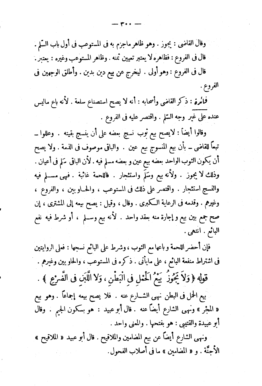 ذَكَرَ الْقَاضِي وَأَصْحَابُهُ: أَنَّهُ لَا يَصِحُّ اسْتِصْنَاعُ سِلْعَةٍ. لِأَنَّهُ بَاعَ مَا لَيْسَ عِنْدَهُ عَلَى غَيْرِ وَجْهِ السَّلَمِ. وَاقْتَصَرَ عَلَيْهِ فِي الْفُرُوعِ. وَقَالُوا أَيْضًا: لَا يَصِحُّ بَيْعُ ثَوْبٍ نَسَجَ بَعْضَهُ عَلَى أَنْ يَنْسِجَ بَقِيَّتَهُ. وَعَلَّلُوا تَبَعًا لِلْقَاضِي بِأَنَّ بَيْعَ الْمَنْسُوجِ بَيْعُ عَيْنٍ. وَالْبَاقِي مَوْصُوفٌ فِي الذِّمَّةِ. وَلَا يَصِحُّ أَنْ يَكُونَ الثَّوْبُ الْوَاحِدُ بَعْضُهُ بَيْعُ عَيْنٍ وَبَعْضُهُ مُسْلَمٌ فِيهِ. لِأَنَّ الْبَاقِي سَلَمٌ فِي أَعْيَانٍ. وَذَلِكَ لَا يَجُوزُ. وَلِأَنَّهُ بَيْعٌ وَسَلَمٌ وَاسْتِئْجَارٌ. فَاللُّحْمَةُ غَائِبَةٌ. فَهِيَ مُسْلَمٌ فِيهِ وَالنَّسْجُ اسْتِئْجَارُ. وَاقْتَصَرَ عَلَى ذَلِكَ فِي الْمُسْتَوْعِبِ، وَالْحَاوِيَيْنِ، وَالْفُرُوعِ، وَغَيْرِهِمْ. وَقَدَّمَهُ فِي الرِّعَايَةِ الْكُبْرَى. وَقَالَ، وَقِيلَ: يَصِحُّ بَيْعُهُ إلَى الْمُشْتَرِي، إنْ صَحَّ جَمْعٌ بَيْنَ بَيْعٍ وَإِجَارَةٍ مِنْهُ بِعَقْدٍ وَاحِدٍ. لِأَنَّهُ بَيْعٌ وَسَلَمٌ، أَوْ شُرِطَ فِيهِ نَفْعُ الْبَائِعِ. انْتَهَى.