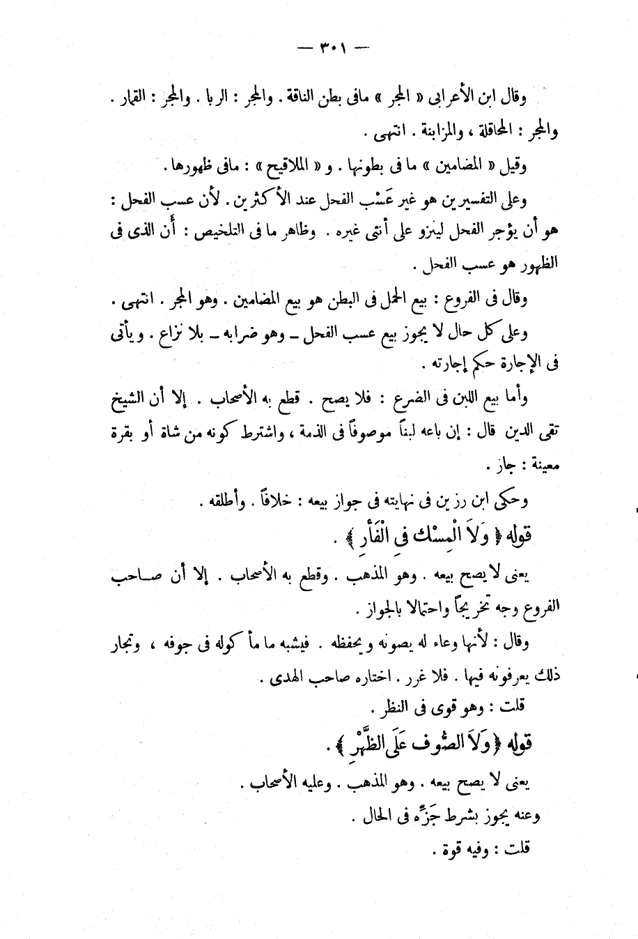 وَقَالَ ابْنُ الْأَعْرَابِيِّ " الْمَجْرُ " مَا فِي بَطْنِ النَّاقَةِ. وَالْمَجْرُ: الرِّبَا. وَالْمَجْرُ: الْقِمَارُ. وَالْمَجْرُ: الْمُحَاقَلَةُ، وَالْمُزَابَنَةُ. انْتَهَى. وَقِيلَ " الْمَضَامِينُ " مَا فِي بُطُونِهَا. " وَالْمَلَاقِيحُ ": مَا فِي ظُهُورِهَا. وَعَلَى التَّفْسِيرَيْنِ هُوَ غَيْرُ عَسْبِ الْفَحْلِ عِنْدَ الْأَكْثَرِينَ. لِأَنَّ عَسْبَ الْفَحْلِ: هُوَ أَنْ يُؤَجَّرَ الْفَحْلُ لِيَنْزُوَ عَلَى أُنْثَى غَيْرِهِ. وَظَاهِرُ مَا فِي التَّلْخِيصِ: أَنَّ الَّذِي فِي الظُّهُورِ هُوَ عَسْبُ الْفَحْلِ. وَقَالَ فِي الْفُرُوعِ: بَيْعُ الْحَمْلِ فِي الْبَطْنِ هُوَ بَيْعِ الْمَضَامِينِ. وَهُوَ الْمَجْرُ. انْتَهَى. وَعَلَى كُلِّ حَالٍ لَا يَجُوزُ بَيْعُ عَسْبِ الْفَحْلِ وَهُوَ ضِرَابُهُ بِلَا نِزَاعٍ. وَيَأْتِي فِي الْإِجَارَةِ حُكْمُ إجَارَتِهِ. وَأَمَّا بَيْعُ اللَّبَنِ فِي الضَّرْعِ: فَلَا يَصِحُّ. قَطَعَ بِهِ الْأَصْحَابُ. إلَّا أَنَّ الشَّيْخَ تَقِيَّ الدِّينِ قَالَ: إنْ بَاعَهُ لَبَنًا مَوْصُوفًا فِي الذِّمَّةِ، وَاشْتَرَطَ كَوْنَهُ مِنْ شَاةٍ أَوْ بَقَرَةٍ مُعَيَّنَةٍ: جَازَ. وَحَكَى ابْنُ رَزِينٍ فِي نِهَايَتِهِ فِي جَوَازِ بَيْعِهِ: خِلَافًا. وَأَطْلَقَهُ.