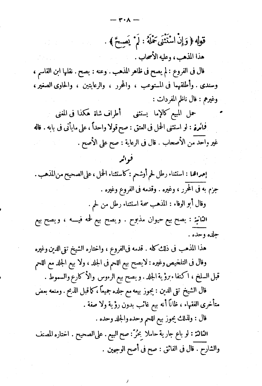 الثَّانِيَةُ: يَصِحُّ بَيْعُ حَيَوَانٍ مَذْبُوحٍ. وَصَحَّ بَيْعُ لَحْمِهِ فِيهِ، وَيَصِحُّ بَيْعُ جِلْدِهِ وَحْدَهُ. هَذَا الْمَذْهَبُ فِي ذَلِكَ كُلِّهِ. قَدَّمَهُ فِي الْفُرُوعِ، وَاخْتَارَهُ الشَّيْخُ تَقِيُّ الدِّينِ وَغَيْرُهُ وَقَالَ فِي التَّلْخِيصِ وَغَيْرِهِ: لَا يَصِحُّ بَيْعُ اللَّحْمِ فِي الْجِلْدِ، وَلَا بَيْعُ الْجِلْدِ مَعَ اللَّحْمِ قَبْلَ السَّلْخِ، اكْتِفَاءً بِرُؤْيَةِ الْجِلْدِ. وَصَحَّ بَيْعُ الرُّءُوسِ وَالْأَكَارِعِ وَالسُّمُوطِ. قَالَ الشَّيْخُ تَقِيُّ الدِّينِ: يَجُوزُ بَيْعُهُ مَعَ جِلْدِهِ جَمِيعًا كَمَا قَبْلَ الذَّبْحِ. وَمَنَعَهُ بَعْضُ مُتَأَخِّرِي الْفُقَهَاءِ، ظَانًّا أَنَّهُ بَيْعُ غَائِبٍ بِدُونِ رُؤْيَةٍ وَلَا صِفَةٍ. قَالَ: وَلِذَلِكَ يَجُوزُ بَيْعُ اللَّحْمِ وَحْدَهُ وَالْجِلْدِ وَحْدَهُ.