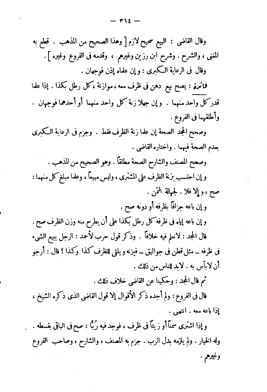 يَصِحُّ بَيْعُ دُهْنٍ فِي ظَرْفٍ مَعَهُ، مُوَازَنَةً، كُلُّ رِطْلٍ بِكَذَا. إذَا عَلِمَا قَدْرَ كُلِّ وَاحِدٍ مِنْهُمَا. وَإِنْ جَهِلَا زِنَةَ كُلِّ وَاحِدٍ مِنْهُمَا أَوْ أَحَدِهِمَا فَوَجْهَانِ. وَأَطْلَقَهُمَا فِي الْفُرُوعِ. وَصَحَّحَ الْمَجْدُ الصِّحَّةَ إنْ عَلِمَا زِنَةَ الظَّرْفِ فَقَطْ. وَجَزَمَ فِي الرِّعَايَةِ الْكُبْرَى بِعَدَمِ الصِّحَّةِ فِيهِمَا. وَاخْتَارَهُ الْقَاضِي. وَصَحَّحَ الْمُصَنِّفُ وَالشَّارِحُ الصِّحَّةَ مُطْلَقًا. وَهُوَ الصَّحِيحُ مِنْ الْمَذْهَبِ. وَإِنْ احْتَسَبَ بِزِنَةِ الظَّرْفِ عَلَى الْمُشْتَرِي، وَلَيْسَ مَبِيعًا، وَعَلِمَا مَبْلَغَ كُلٍّ مِنْهُمَا: صَحَّ، وَإِلَّا فَلَا. لِجَهَالَةِ الثَّمَنِ. وَإِنْ بَاعَهُ جُزَافًا بِظَرْفِهِ أَوْ دُونَهُ صَحَّ. وَإِنْ بَاعَهُ إيَّاهُ فِي ظَرْفِهِ كُلَّ رِطْلٍ بِكَذَا عَلَى أَنْ يَطْرَحَ مِنْهُ وَزْنَ الظَّرْفِ صَحَّ. قَالَ الْمَجْدُ: لَا نَعْلَمُ فِيهِ خِلَافًا. وَذَكَرَ قَوْلَ حَرْبٍ لِأَحْمَدَ: الرَّجُلُ يَبِيعُ الشَّيْءَ فِي ظَرْفِهِ مِثْلَ قُطْنٍ فِي جَوَالِيقَ فَيَزِنُهُ وَيُلْقِي لِلظَّرْفِ كَذَا وَكَذَا؟ قَالَ: أَرْجُو أَنْ لَا بَأْسَ بِهِ. لَا بُدَّ لِلنَّاسِ مِنْ ذَلِكَ. ثُمَّ قَالَ الْمَجْدُ: وَحَكَيْنَا عَنْ الْقَاضِي خِلَافَ ذَلِكَ. قَالَ فِي الْفُرُوعِ: وَلَمْ أَجِدْهُ ذَكَرَ الْأَقْوَالَ إلَّا قَوْلَ الْقَاضِي الَّذِي ذَكَرَهُ الشَّيْخُ، إذَا بَاعَهُ مَعَهُ. انْتَهَى. وَإِذَا اشْتَرَى سَمْنًا أَوْ زَيْتًا فِي ظَرْفٍ، فَوَجَدَ فِيهِ رُبًّا: صَحَّ فِي الْبَاقِي بِقِسْطِهِ. وَلَهُ الْخِيَارُ. وَلَمْ يَلْزَمْهُ بَدَلُ الرُّبِّ. جَزَمَ بِهِ الْمُصَنِّفُ، وَالشَّارِحُ، وَصَاحِبُ الْفُرُوعِ وَغَيْرُهُمْ.