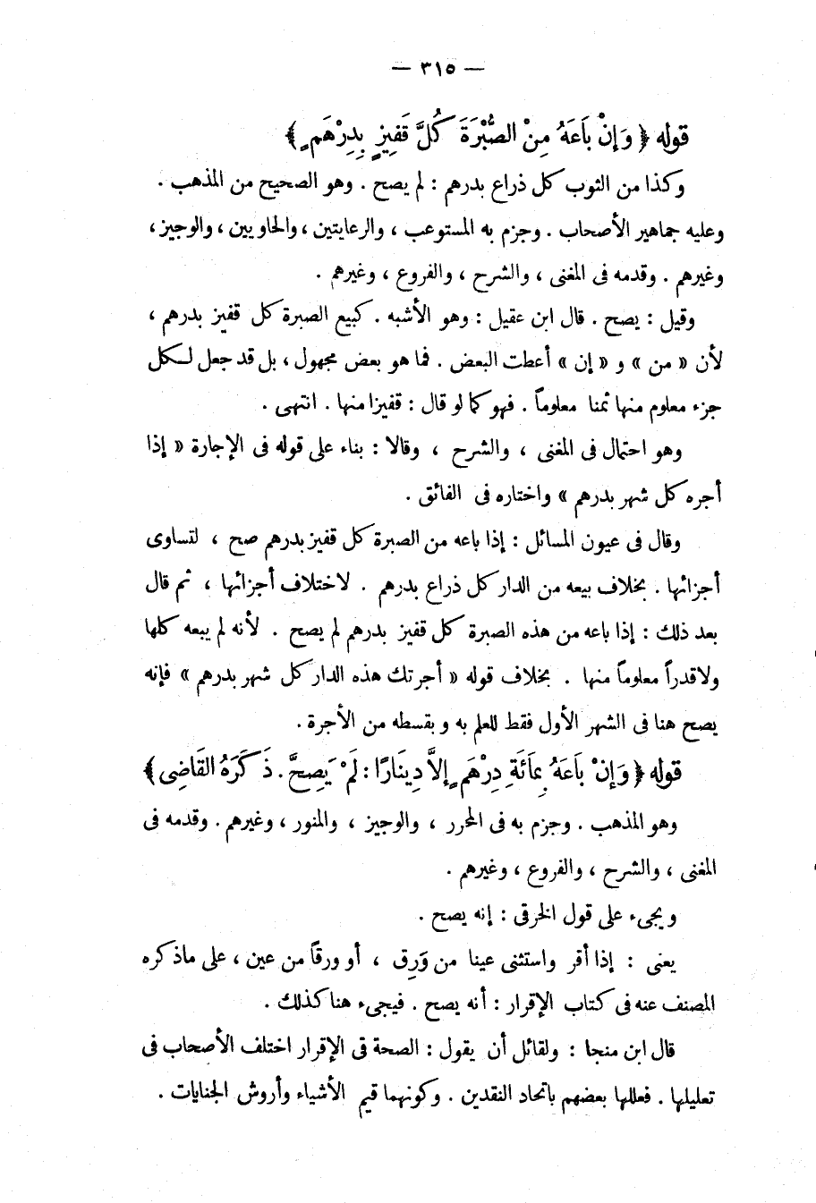 قَوْلُهُ (وَإِنْ بَاعَهُ بِمِائَةِ دِرْهَمٍ إلَّا دِينَارًا: لَمْ يَصِحَّ. ذَكَرَهُ الْقَاضِي) وَهُوَ الْمَذْهَبُ. وَجَزَمَ بِهِ فِي الْمُحَرَّرِ، وَالْوَجِيزِ، وَالْمُنَوِّرِ، وَغَيْرِهِمْ. وَقَدَّمَهُ فِي الْمُغْنِي، وَالشَّرْحِ، وَالْفُرُوعِ، وَغَيْرِهِمْ. وَيَجِيءُ عَلَى قَوْلِ الْخِرَقِيِّ: أَنَّهُ يَصِحُّ. يَعْنِي: إذَا أَقَرَّ وَاسْتَثْنَى عَيْنًا مِنْ وَرِقٍ، أَوْ وَرِقًا مِنْ عَيْنٍ، عَلَى مَا ذَكَرَهُ الْمُصَنِّفُ عَنْهُ فِي كِتَابِ الْإِقْرَارِ: أَنَّهُ يَصِحُّ. فَيَجِيءُ هُنَا كَذَلِكَ. قَالَ ابْنُ مُنَجَّا: وَلِقَائِلٍ أَنْ يَقُولَ: الصِّحَّةُ فِي الْإِقْرَارِ اخْتَلَفَ الْأَصْحَابُ فِي تَعْلِيلِهَا. فَعَلَّلَهَا بَعْضُهُمْ بِاتِّحَادِ النَّقْدَيْنِ. وَكَوْنِهِمَا قِيَمَ الْأَشْيَاءِ وَأُرُوشَ الْجِنَايَاتِ.