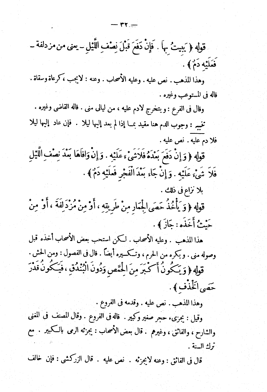 قَوْلُهُ (يَبِيتُ بِهَا فَإِنْ دَفَعَ قَبْلَ نِصْفِ اللَّيْلِ يَعْنِي مِنْ مُزْدَلِفَةَ فَعَلَيْهِ دَمٌ) وَهَذَا الْمَذْهَبُ نَصَّ عَلَيْهِ وَعَلَيْهِ الْأَصْحَابُ وَعَنْهُ: لَا يَجِبُ كَرُعَاةٍ وَسُقَاةٍ قَالَهُ فِي الْمُسْتَوْعِبِ وَغَيْرِهِ وَقَالَ فِي الْفَرْعِ: وَيَتَخَرَّجُ لَا دَمَ عَلَيْهِ، مِنْ لَيَالِي مِنًى قَالَهُ الْقَاضِي وَغَيْرُهُ.