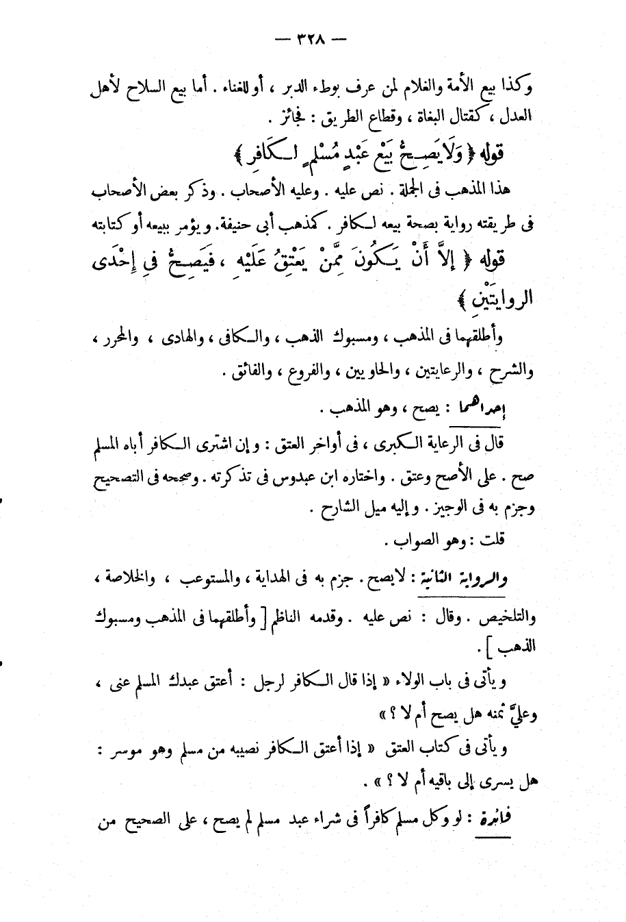 قَوْلُهُ (وَلَا يَصِحُّ بَيْعُ عَبْدٍ مُسْلِمٍ لِكَافِرٍ) هَذَا الْمَذْهَبُ فِي الْجُمْلَةِ. نُصَّ عَلَيْهِ. وَعَلَيْهِ الْأَصْحَابُ. وَذَكَرَ بَعْضُ الْأَصْحَابِ فِي طَرِيقَتِهِ رِوَايَةً بِصِحَّةِ بَيْعِهِ لِكَافِرٍ. كَمَذْهَبِ أَبِي حَنِيفَةَ. وَيُؤْمَرُ بِبَيْعِهِ أَوْ كِتَابَتِهِ قَوْلُهُ (إلَّا أَنْ يَكُونَ مِمَّنْ يُعْتَقُ عَلَيْهِ، فَيَصِحُّ فِي إحْدَى الرِّوَايَتَيْنِ) وَأَطْلَقَهُمَا فِي الْمُذْهَبِ، وَمَسْبُوكِ الذَّهَبِ، وَالْكَافِي، وَالْهَادِي، وَالْمُحَرَّرِ، وَالشَّرْحِ، وَالرِّعَايَتَيْنِ، وَالْحَاوِيَيْنِ، وَالْفُرُوعِ، وَالْفَائِقِ. إحْدَاهُمَا: يَصِحُّ، وَهُوَ الْمَذْهَبُ. قَالَ فِي الرِّعَايَةِ الْكُبْرَى، فِي أَوَاخِرِ الْعِتْقِ: وَإِنْ اشْتَرَى، الْكَافِرُ أَبَاهُ الْمُسْلِمَ صَحَّ. عَلَى الْأَصَحِّ وَعَتَقَ. وَاخْتَارَهُ ابْنُ عَبْدُوسٍ فِي تَذْكِرَتِهِ. وَصَحَّحَهُ فِي التَّصْحِيحِ وَجَزَمَ بِهِ فِي الْوَجِيزِ. وَإِلَيْهِ مَيْلُ الشَّارِحِ. قُلْت: وَهُوَ الصَّوَابُ.
