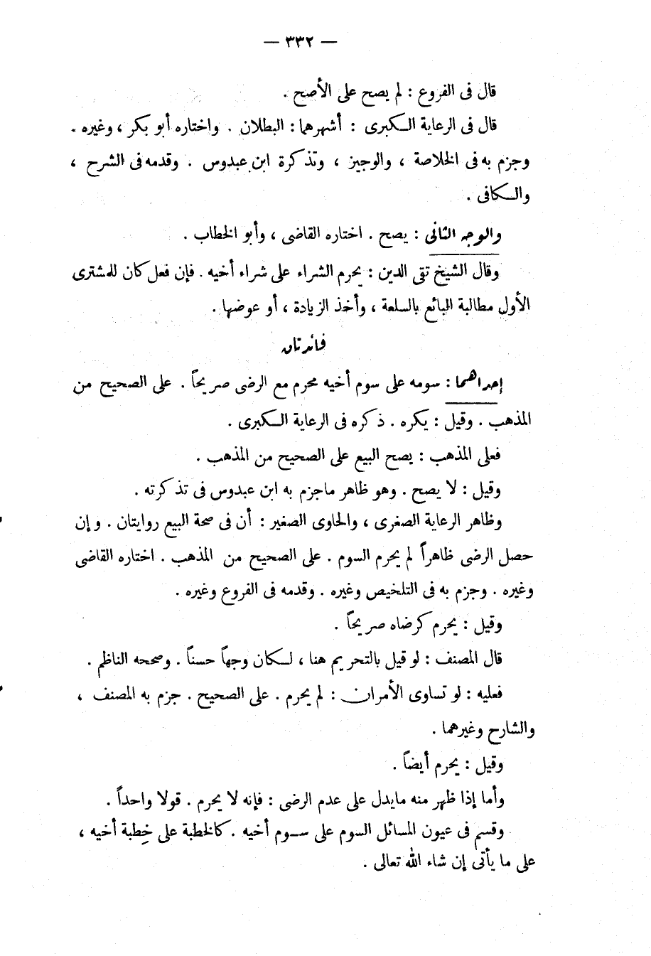 إحْدَاهُمَا: سَوْمُهُ عَلَى سَوْمِ أَخِيهِ مُحَرَّمٌ مَعَ الرِّضَى صَرِيحًا. عَلَى الصَّحِيحِ مِنْ الْمَذْهَبِ. وَقِيلَ: يُكْرَهُ. ذَكَرَهُ فِي الرِّعَايَةِ الْكُبْرَى. فَعَلَى الْمَذْهَبِ: يَصِحُّ الْبَيْعُ عَلَى الصَّحِيحِ مِنْ الْمَذْهَبِ. وَقِيلَ: لَا يَصِحُّ. وَهُوَ ظَاهِرُ مَا جَزَمَ بِهِ ابْنُ عَبْدُوسٍ فِي تَذْكِرَتِهِ. وَظَاهِرُ الرِّعَايَةِ الصُّغْرَى، وَالْحَاوِي الصَّغِيرِ: أَنَّ فِي صِحَّةِ الْبَيْعِ رِوَايَتَيْنِ. وَإِنْ حَصَلَ الرِّضَى ظَاهِرًا لَمْ يَحْرُمْ السَّوْمُ. عَلَى الصَّحِيحِ مِنْ الْمَذْهَبِ. اخْتَارَهُ الْقَاضِي وَغَيْرُهُ. وَجَزَمَ بِهِ فِي التَّلْخِيصِ وَغَيْرِهِ. وَقَدَّمَهُ فِي الْفُرُوعِ وَغَيْرِهِ. وَقِيلَ: يَحْرُمُ كَرِضَاهُ صَرِيحًا. قَالَ الْمُصَنِّفُ: لَوْ قِيلَ بِالتَّحْرِيمِ هُنَا، لَكَانَ وَجْهًا حَسَنًا. وَصَحَّحَهُ النَّاظِمُ فَعَلَيْهِ: لَوْ تَسَاوَى الْأَمْرَانِ: لَمْ يَحْرُمْ. عَلَى الصَّحِيحِ. جَزَمَ بِهِ الْمُصَنِّفُ. وَالشَّارِحُ وَغَيْرُهُمَا. وَقِيلَ: يَحْرُمُ أَيْضًا. وَأَمَّا إذَا ظَهَرَ مِنْهُ مَا يَدُلُّ عَلَى عَدَمِ الرِّضَى: فَإِنَّهُ لَا يَحْرُمُ. قَوْلًا وَاحِدًا. وَقَسَّمَ فِي عُيُونِ الْمَسَائِلِ السَّوْمَ عَلَى سَوْمِ أَخِيهِ. كَالْخِطْبَةِ عَلَى خِطْبَةِ أَخِيهِ، عَلَى مَا يَأْتِي إنْ شَاءَ اللَّهُ تَعَالَى.