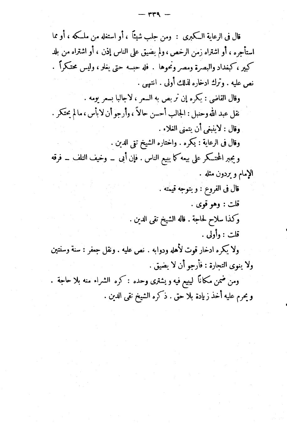 قَالَ فِي الرِّعَايَةِ الْكُبْرَى: وَمَنْ جَلَبَ شَيْئًا، أَوْ اسْتَغَلَّهُ مِنْ مِلْكِهِ، أَوْ مِمَّا اسْتَأْجَرَهُ، أَوْ اشْتَرَاهُ زَمَنَ الرُّخْصِ، وَلَمْ يُضَيِّقْ عَلَى النَّاسِ إذَنْ، أَوْ اشْتَرَاهُ مِنْ بَلَدٍ كَبِيرٍ، كَبَغْدَادَ وَالْبَصْرَةِ وَمِصْرَ وَنَحْوِهَا. فَلَهُ حَبْسُهُ حَتَّى يَغْلُوَ، وَلَيْسَ مُحْتَكِرًا. نُصَّ عَلَيْهِ. وَتَرْكُ ادِّخَارِهِ. لِذَلِكَ أَوْلَى. انْتَهَى. وَقَالَ الْقَاضِي: يُكْرَهُ إنْ تَرَبَّصَ بِهِ السِّعْرَ، لَا جَالِبًا بِسِعْرِ يَوْمِهِ. نَقَلَ عَبْدُ اللَّهِ وَحَنْبَلٌ: الْجَالِبُ أَحْسَنُ حَالًا، وَأَرْجُو أَنْ لَا بَأْسَ، مَا لَمْ يَحْتَكِرْ. وَقَالَ: لَا يَنْبَغِي أَنْ يَتَمَنَّى الْغَلَاءَ. وَقَالَ فِي الرِّعَايَةِ الصُّغْرَى: يُكْرَهُ. وَاخْتَارَهُ الشَّيْخُ تَقِيُّ الدِّينِ. وَيُجْبَرُ الْمُحْتَكِرُ عَلَى بَيْعِهِ كَمَا يَبِيعُ النَّاسُ. فَإِنْ أَبَى وَخِيفَ التَّلَفُ فَرَّقَهُ الْإِمَامُ وَيَرُدُّونَ مِثْلَهُ. قَالَ فِي الْفُرُوعِ: وَيَتَوَجَّهُ قِيمَتُهُ. قُلْت: وَهُوَ قَوِيٌّ. وَكَذَا سِلَاحٌ لِحَاجَةٍ. قَالَهُ الشَّيْخُ تَقِيُّ الدِّينِ. قُلْت: وَأَوْلَى. وَلَا يُكْرَهُ ادِّخَارُ قُوتٍ لِأَهْلِهِ وَدَوَابِّهِ. نُصَّ عَلَيْهِ. وَنَقَلَ جَعْفَرٌ: سَنَةً وَسَنَتَيْنِ وَلَا يَنْوِي التِّجَارَةَ: فَأَرْجُو أَنْ لَا يُضَيِّقَ. وَمَنْ ضَمِنَ مَكَانًا لِيَبِيعَ فِيهِ وَيَشْتَرِي وَحْدَهُ: كُرِهَ الشِّرَاءُ مِنْهُ بِلَا حَاجَةٍ. وَيَحْرُمُ عَلَيْهِ أَخْذُ زِيَادَةٍ بِلَا حَقٍّ. ذَكَرَهُ الشَّيْخُ تَقِيُّ الدِّينِ.