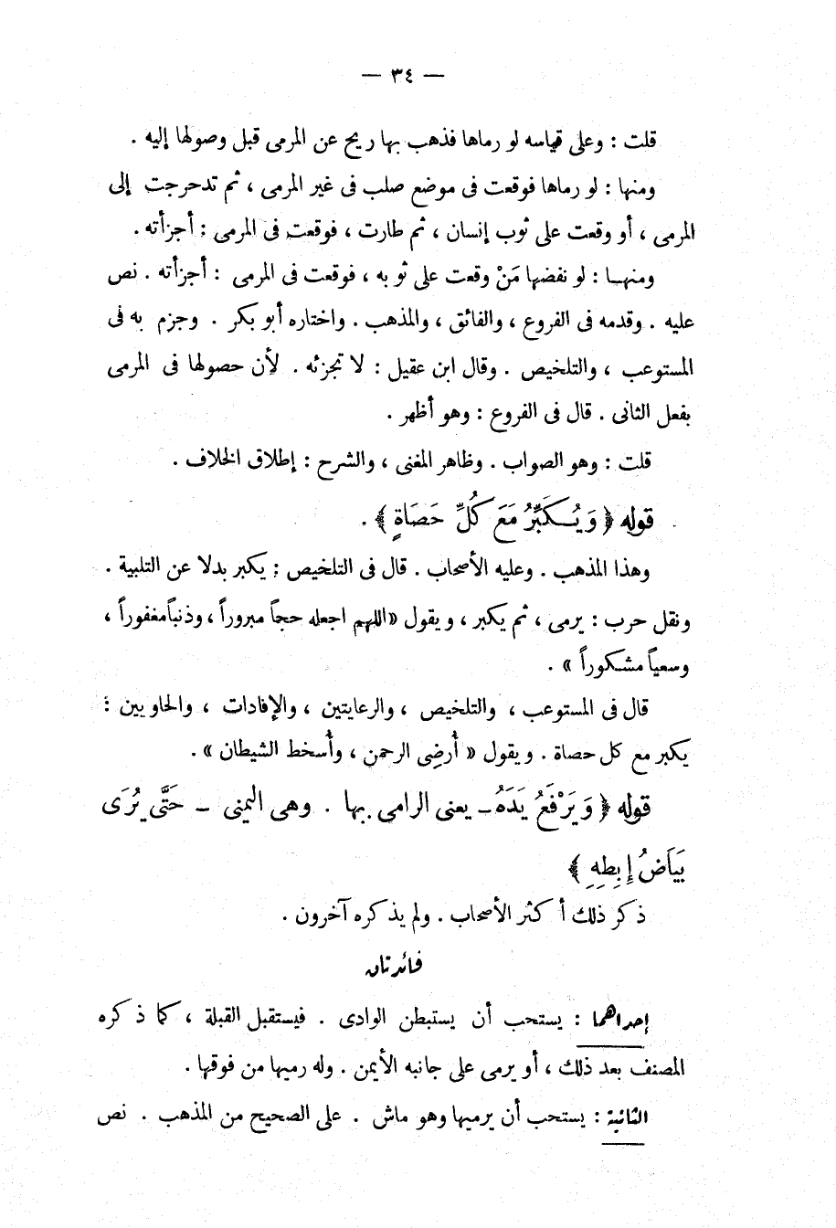 قُلْت: وَعَلَى قِيَاسِهِ لَوْ رَمَاهَا فَذَهَبَ بِهَا رِيحٌ عَنْ الْمَرْمَى قَبْلَ وُصُولِهَا إلَيْهِ وَمِنْهَا: لَوْ رَمَاهَا فَوَقَعَتْ فِي مَوْضِعٍ صُلْبٍ فِي غَيْرِ الْمَرْمَى، ثُمَّ تَدَحْرَجَتْ إلَى الْمَرْمَى، أَوْ وَقَعَتْ عَلَى ثَوْبِ إنْسَانٍ، ثُمَّ طَارَتْ، فَوَقَعَتْ فِي الْمَرْمَى: أَجْزَأَتْهُ وَمِنْهَا: لَوْ نَفَضَهَا مَنْ وَقَعَتْ عَلَى ثَوْبِهِ، فَوَقَعَتْ فِي الْمَرْمَى: أَجْزَأَتْهُ نَصَّ عَلَيْهِ وَقَدَّمَهُ فِي الْفُرُوعِ، وَالْفَائِقِ، وَالْمُذْهَبِ وَاخْتَارَهُ أَبُو بَكْرٍ وَجَزَمَ بِهِ فِي الْمُسْتَوْعِبِ، وَالتَّلْخِيصِ وَقَالَ ابْنُ عَقِيلٍ: لَا تُجْزِئُهُ لِأَنَّ حُصُولَهَا فِي الْمَرْمَى بِفِعْلِ الثَّانِي قَالَ فِي الْفُرُوعِ: وَهُوَ أَظْهَرُ قُلْت: وَهُوَ الصَّوَابُ وَظَاهِرُ الْمُغْنِي، وَالشَّرْحِ: إطْلَاقُ الْخِلَافِ قَوْلُهُ (وَيُكَبِّرُ مَعَ كُلِّ حَصَاةٍ) وَهَذَا الْمَذْهَبُ وَعَلَيْهِ الْأَصْحَابُ قَالَ فِي التَّلْخِيصِ: يُكَبِّرُ بَدَلًا عَنْ التَّلْبِيَةِ وَنَقَلَ حَرْبٌ: يَرْمِي، ثُمَّ يُكَبِّرُ، وَيَقُولُ " اللَّهُمَّ اجْعَلْهُ حَجًّا مَبْرُورًا، وَذَنْبًا مَغْفُورًا، وَسَعْيًا مَشْكُورًا " قَالَ فِي الْمُسْتَوْعِبِ، وَالتَّلْخِيصِ، وَالرِّعَايَتَيْنِ، وَالْإِفَادَاتِ، وَالْحَاوِيَيْنِ: يُكَبِّرُ مَعَ كُلِّ حَصَاةٍ وَيَقُولُ " أُرْضِي الرَّحْمَنَ، وَأُسْخِطُ الشَّيْطَانَ " قَوْلُهُ (وَيَرْفَعُ يَدَهُ يَعْنِي الرَّامِيَ بِهَا وَهِيَ الْيُمْنَى حَتَّى يُرَى بَيَاضُ إبْطِهِ) ذَكَرَ ذَلِكَ أَكْثَرُ الْأَصْحَابِ وَلَمْ يَذْكُرْهُ آخَرُونَ.