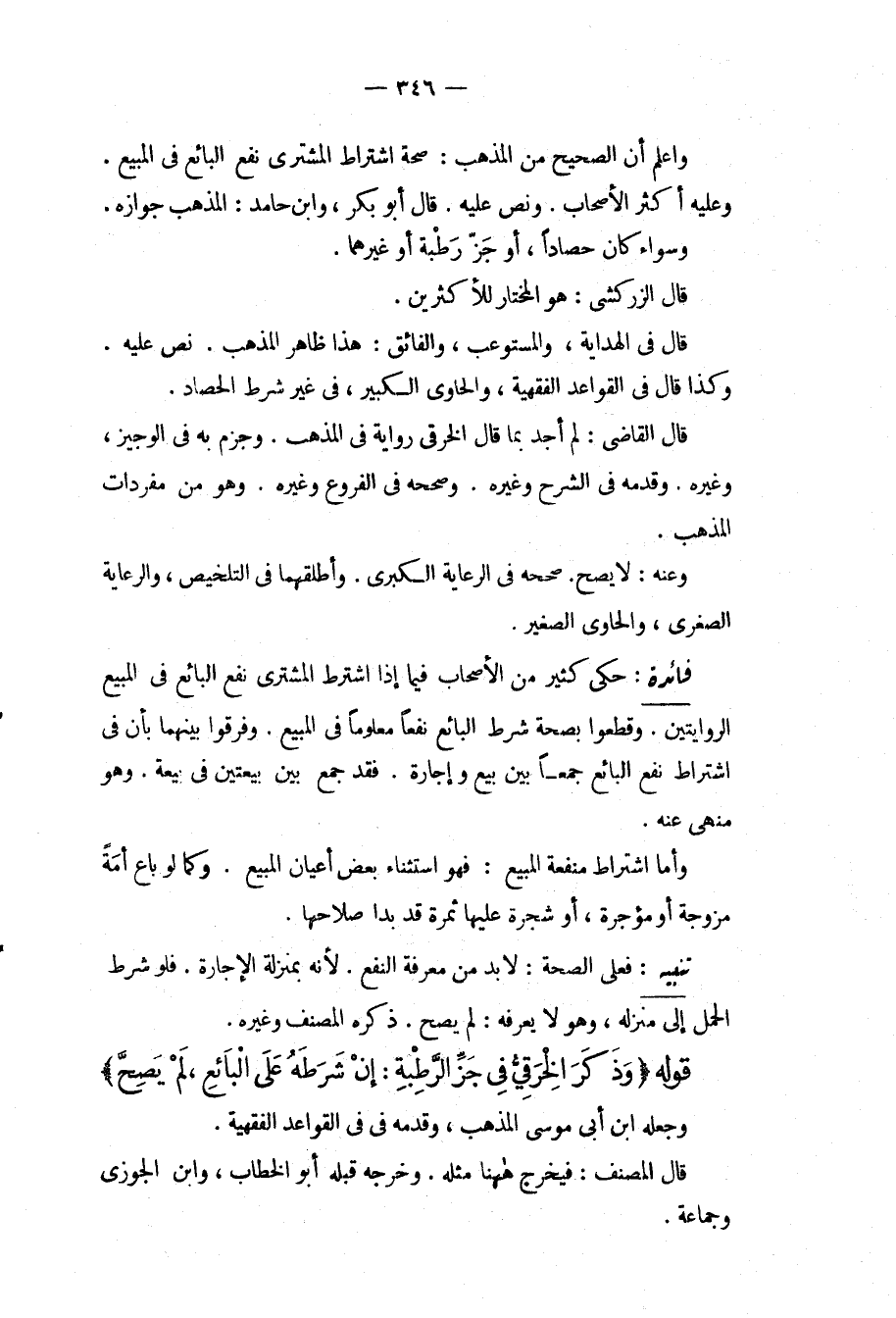 وَاعْلَمْ أَنَّ الصَّحِيحَ مِنْ الْمَذْهَبِ: صِحَّةُ اشْتِرَاطِ الْمُشْتَرِي نَفْعَ الْبَائِعِ فِي الْمَبِيعِ. وَعَلَيْهِ أَكْثَرُ الْأَصْحَابِ. وَنُصَّ عَلَيْهِ. قَالَ أَبُو بَكْرٍ، وَابْنُ حَامِدٍ: الْمَذْهَبُ جَوَازُهُ. وَسَوَاءٌ كَانَ حَصَادًا، أَوْ جَزَّ رَطْبَةً أَوْ غَيْرَهُمَا. قَالَ الزَّرْكَشِيُّ: هُوَ الْمُخْتَارُ لِلْأَكْثَرَيْنِ. قَالَ فِي الْهِدَايَةِ، وَالْمُسْتَوْعِبِ، وَالْفَائِقِ: هَذَا ظَاهِرُ الْمَذْهَبِ. نُصَّ عَلَيْهِ. وَكَذَا قَالَ فِي الْقَوَاعِدِ الْفِقْهِيَّةِ، وَالْحَاوِي الْكَبِيرِ، فِي غَيْرِ شَرْطِ الْحَصَادِ. قَالَ الْقَاضِي: لَمْ أَجِدْ بِمَا قَالَ الْخِرَقِيُّ رِوَايَةً فِي الْمُذْهَبِ. وَجَزَمَ بِهِ فِي الْوَجِيزِ، وَغَيْرِهِ. وَقَدَّمَهُ فِي الشَّرْحِ وَغَيْرِهِ. وَصَحَّحَهُ فِي الْفُرُوعِ وَغَيْرِهِ. وَهُوَ مِنْ مُفْرَدَاتِ الْمَذْهَبِ. وَعَنْهُ: لَا يَصِحُّ. صَحَّحَهُ فِي الرِّعَايَةِ الْكُبْرَى. وَأَطْلَقَهُمَا فِي التَّلْخِيصِ، وَالرِّعَايَةِ الصُّغْرَى، وَالْحَاوِي الصَّغِيرِ.