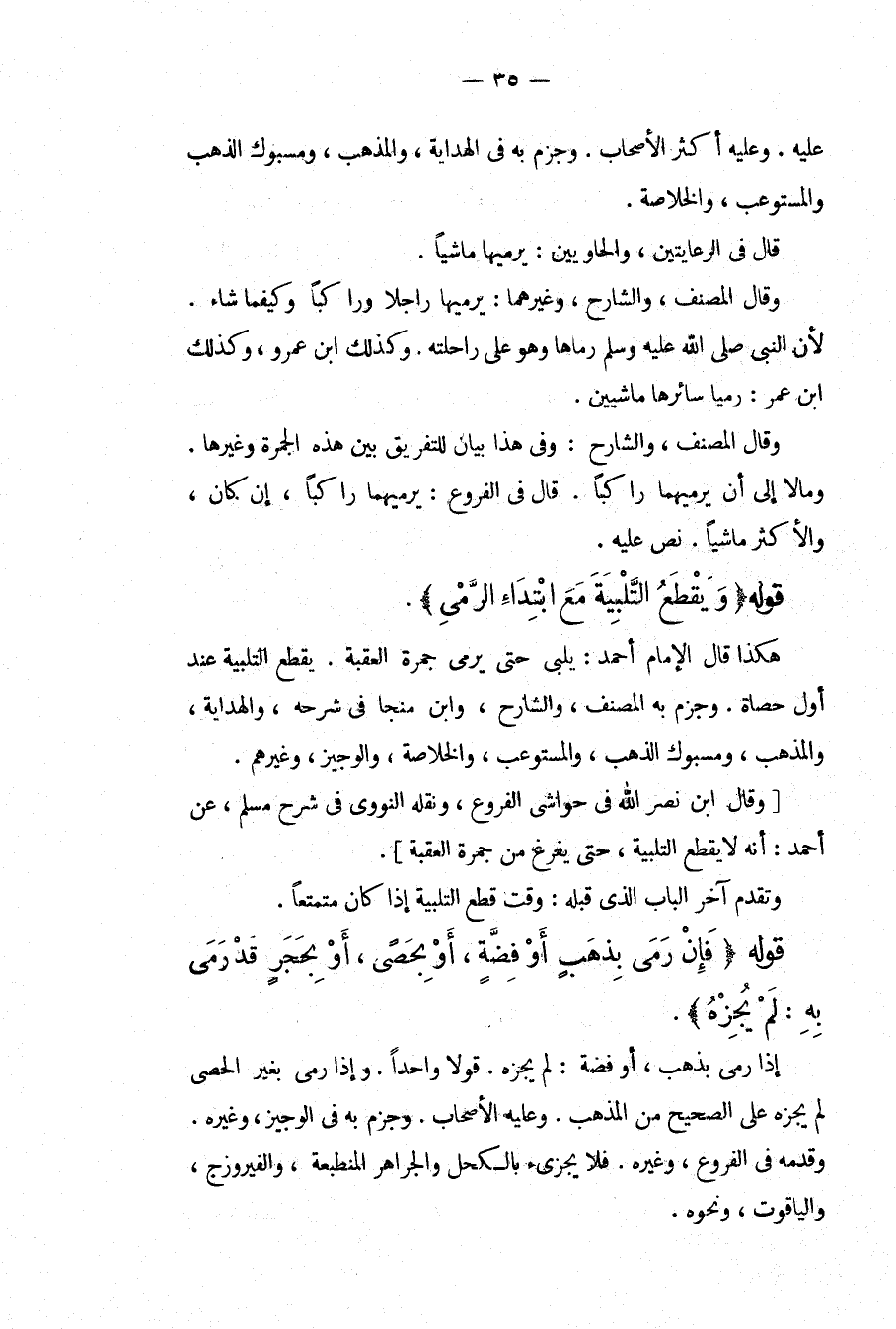 قَوْلُهُ (وَيَقْطَعُ التَّلْبِيَةَ مَعَ ابْتِدَاءِ الرَّمْيِ) هَكَذَا قَالَ الْإِمَامُ أَحْمَدُ: يُلَبِّي حَتَّى يَرْمِيَ جَمْرَةَ الْعَقَبَةِ يَقْطَعُ التَّلْبِيَةَ عِنْدَ أَوَّلِ حَصَاةٍ وَجَزَمَ بِهِ الْمُصَنِّفُ، وَالشَّارِحُ، وَابْنُ مَنْجَا فِي شَرْحِهِ، وَالْهِدَايَةُ، وَالْمُذْهَبَ، وَمَسْبُوكُ الذَّهَبِ، وَالْمُسْتَوْعِبُ، وَالْخُلَاصَةُ، وَالْوَجِيزُ، وَغَيْرُهُمْ.