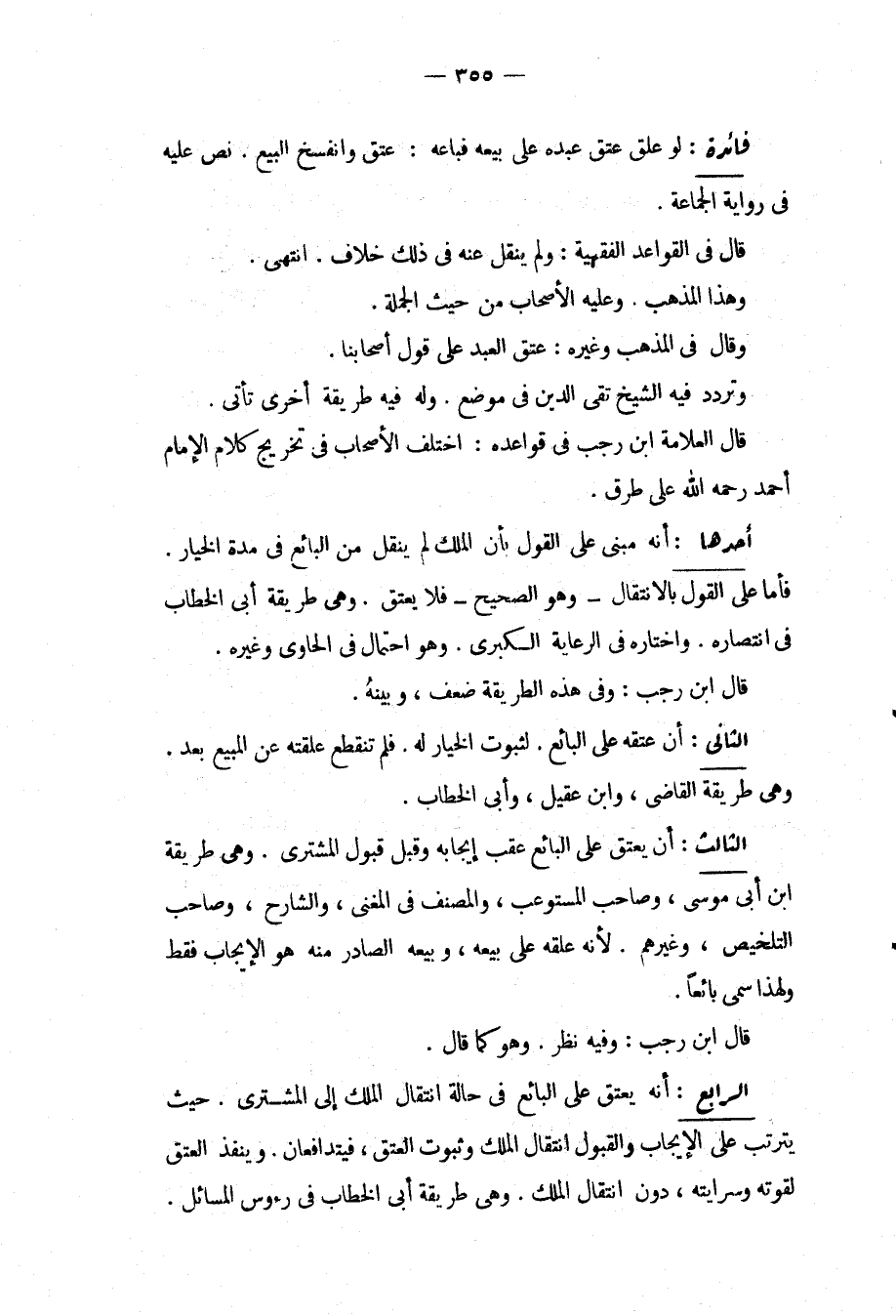 الثَّالِثُ: أَنْ يَعْتِقَ عَلَى الْبَائِعِ عَقِبَ إيجَابِهِ وَقَبْلَ قَبُولِ الْمُشْتَرِي. وَهِيَ طَرِيقَةُ ابْنِ أَبِي مُوسَى، وَصَاحِبِ الْمُسْتَوْعِبِ، وَالْمُصَنِّفِ فِي الْمُغْنِي، وَالشَّارِحِ، وَصَاحِبِ التَّلْخِيصِ، وَغَيْرِهِمْ. لِأَنَّهُ عَلَّقَهُ عَلَى بَيْعِهِ، وَبَيْعُهُ الصَّادِرُ مِنْهُ هُوَ الْإِيجَابُ فَقَطْ وَلِهَذَا سُمِّيَ بَائِعًا. قَالَ ابْنُ رَجَبٍ: وَفِيهِ نَظَرٌ. وَهُوَ كَمَا قَالَ.