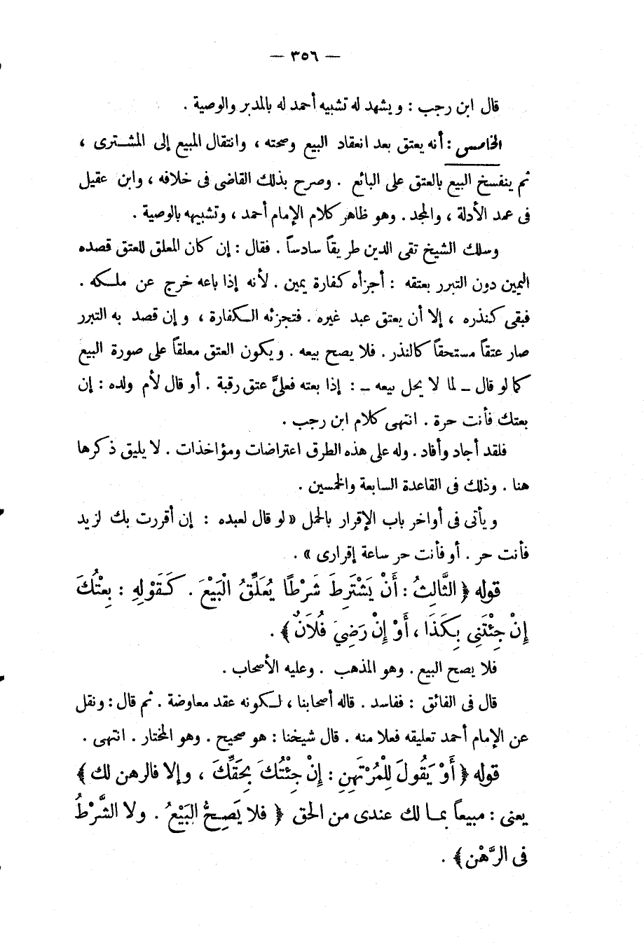 الْخَامِسُ: أَنَّهُ يُعْتَقُ بَعْدَ انْعِقَادِ الْبَيْعِ وَصِحَّتِهِ، وَانْتِقَالِ الْمَبِيعِ إلَى الْمُشْتَرِي، ثُمَّ يَنْفَسِخُ الْبَيْعُ بِالْعِتْقِ عَلَى الْبَائِعِ. وَصَرَّحَ بِذَلِكَ الْقَاضِي فِي خِلَافِهِ، وَابْنُ عَقِيلٍ فِي عُمَدِ الْأَدِلَّةِ، وَالْمَجْدُ. وَهُوَ ظَاهِرُ كَلَامِ الْإِمَامِ أَحْمَدَ، وَتَشْبِيهُهُ بِالْوَصِيَّةِ. وَسَلَكَ الشَّيْخُ تَقِيُّ الدِّينِ طَرِيقًا سَادِسًا. فَقَالَ: إنْ كَانَ الْمُعَلَّقُ لِلْعِتْقِ قَصْدَهُ الْيَمِينَ دُونَ التَّبَرُّرِ بِعِتْقِهِ: أَجْزَأَهُ كَفَّارَةُ يَمِينٍ. لِأَنَّهُ إذَا بَاعَهُ خَرَجَ عَنْ مِلْكِهِ. فَبَقِيَ كَنَذْرِهِ، إلَّا أَنْ يَعْتِقَ عَبْدَ غَيْرِهِ. فَتُجْزِئُهُ الْكَفَّارَةُ، وَإِنْ قَصَدَ بِهِ التَّبَرُّرَ صَارَ عِتْقًا مُسْتَحَقًّا كَالنَّذْرِ. فَلَا يَصِحُّ بَيْعُهُ. وَيَكُونُ الْعِتْقُ مُعَلَّقًا فِي صُورَةِ الْبَيْعِ كَمَا لَوْ قَالَ لِمَا لَا يَحِلُّ بَيْعُهُ: إذَا بِعْته فَعَلَيَّ عِتْقُ رَقَبَةٍ. أَوْ قَالَ لِأُمِّ وَلَدِهِ: إنْ بِعْتُك فَأَنْتِ حُرَّةٌ. انْتَهَى كَلَامُ ابْنِ رَجَبٍ. فَلَقَدْ أَجَادَ وَأَفَادَ. وَلَهُ عَلَى هَذِهِ الطُّرُقِ اعْتِرَاضَاتٌ وَمُؤَاخَذَاتٌ. لَا يَلِيقُ ذِكْرُهَا هُنَا. وَذَلِكَ فِي الْقَاعِدَةِ السَّابِعَةِ وَالْخَمْسِينَ. وَيَأْتِي فِي أَوَاخِرِ بَابِ الْإِقْرَارِ بِالْحَمْلِ " لَوْ قَالَ لِعَبْدِهِ: إنْ أَقْرَرْت بِك لِزَيْدٍ فَأَنْتَ حُرٌّ. أَوْ فَأَنْتَ حُرٌّ سَاعَةَ إقْرَارِي ".