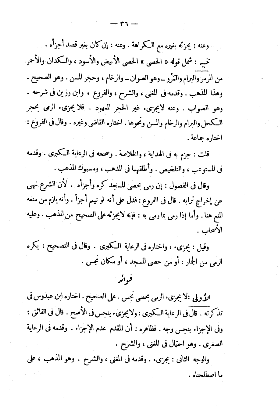 شَمَلَ قَوْلُهُ " الْحَصَى " الْحَصَى الْأَبْيَضَ وَالْأَسْوَدَ، وَالْكِدَانَ وَالْأَحْمَرَ مِنْ الْمَرْمَرِ وَالْبِرَامِ وَالْمَرْوِ وَهُوَ الصِّوَانُ وَالرُّخَامِ، وَحَجَرِ الْمِسَنِّ وَهُوَ الصَّحِيحُ وَهَذَا الْمَذْهَبُ وَقَدَّمَهُ فِي الْمُغْنِي، وَالشَّرْحِ، وَالْفُرُوعِ، وَابْنُ رَزِينٍ فِي شَرْحِهِ وَهُوَ الصَّوَابُ وَعَنْهُ لَا يُجْزِئُ غَيْرُ الْحَجَرِ الْمَعْهُودِ فَلَا يُجْزِئُ الرَّمْيُ بِحَجَرِ الْكُحْلِ وَالْبِرَامِ وَالرُّخَامِ وَالْمِسَنِّ وَنَحْوِهَا اخْتَارَهُ الْقَاضِي وَغَيْرُهُ وَقَالَ فِي الْفُرُوعِ: اخْتَارَهُ جَمَاعَةٌ قُلْت: جَزَمَ بِهِ فِي الْهِدَايَةِ، وَالْخُلَاصَةِ وَصَحَّحَهُ فِي الرِّعَايَةِ الْكُبْرَى وَقَدَّمَهُ فِي الْمُسْتَوْعِبِ، وَالتَّلْخِيصِ وَأَطْلَقَهُمَا فِي الْمُذْهَبِ، وَمَسْبُوكِ الذَّهَبِ وَقَالَ فِي الْفُصُولِ: إنْ رَمَى بِحَصَى الْمَسْجِدِ كُرِهَ وَأَجْزَأَهُ لِأَنَّ الشَّرْعَ نَهَى عَنْ إخْرَاجِ تُرَابِهِ قَالَ فِي الْفُرُوعِ: فَدَلَّ عَلَى أَنَّهُ لَوْ تَيَمَّمَ أَجْزَأَ وَأَنَّهُ يَلْزَمُ مِنْ مَنْعِهِ الْمَنْعُ هُنَا وَأَمَّا إذَا رَمَى بِمَا رَمَى بِهِ: فَإِنَّهُ لَا يُجْزِئُهُ عَلَى الصَّحِيحِ مِنْ الْمَذْهَبِ وَعَلَيْهِ الْأَصْحَابُ وَقِيلَ: يُجْزِئُ، وَاخْتَارَهُ فِي الرِّعَايَةِ الْكُبْرَى وَقَالَ فِي التَّصْحِيحِ: يُكْرَهُ الرَّمْيُ مِنْ الْجِمَارِ، أَوْ مِنْ حَصَى الْمَسْجِدِ، أَوْ مَكَان نَجِسٍ فَوَائِدُ.
