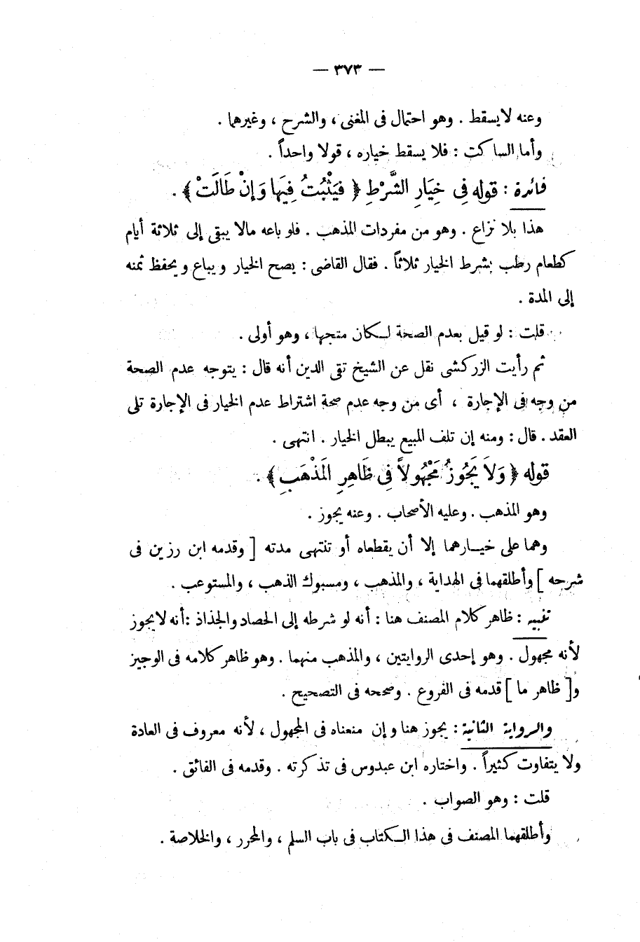 قَوْلُهُ فِي خِيَارِ الشَّرْطِ (فَيَثْبُتُ فِيهَا وَإِنْ طَالَتْ) . هَذَا بِلَا نِزَاعٍ. وَهُوَ مِنْ مُفْرَدَاتِ الْمَذْهَبِ. فَلَوْ بَاعَهُ مَا لَا يَبْقَى إلَى ثَلَاثَةِ أَيَّامٍ كَطَعَامٍ رَطْبٍ بِشَرْطِ الْخِيَارِ ثَلَاثًا. فَقَالَ الْقَاضِي: يَصِحُّ الْخِيَارُ وَيُبَاعُ وَيُحْفَظُ ثَمَنُهُ إلَى الْمُدَّةِ. قُلْت: لَوْ قِيلَ بِعَدَمِ الصِّحَّةِ لَكَانَ مُتَّجَهًا، وَهُوَ أَوْلَى. ثُمَّ رَأَيْت الزَّرْكَشِيَّ نَقَلَ عَنْ الشَّيْخِ تَقِيِّ الدِّينِ أَنَّهُ قَالَ: يَتَوَجَّهُ عَدَمُ الصِّحَّةِ مِنْ وَجْهٍ فِي الْإِجَارَةِ، أَيْ مِنْ وَجْهِ عَدَمِ صِحَّةِ اشْتِرَاطِ عَدَمِ الْخِيَارِ فِي الْإِجَارَةِ تَلِي الْعَقْدَ. قَالَ: وَمِنْهُ إنْ تَلِفَ الْمَبِيعُ يَبْطُلُ الْخِيَارُ. انْتَهَى.