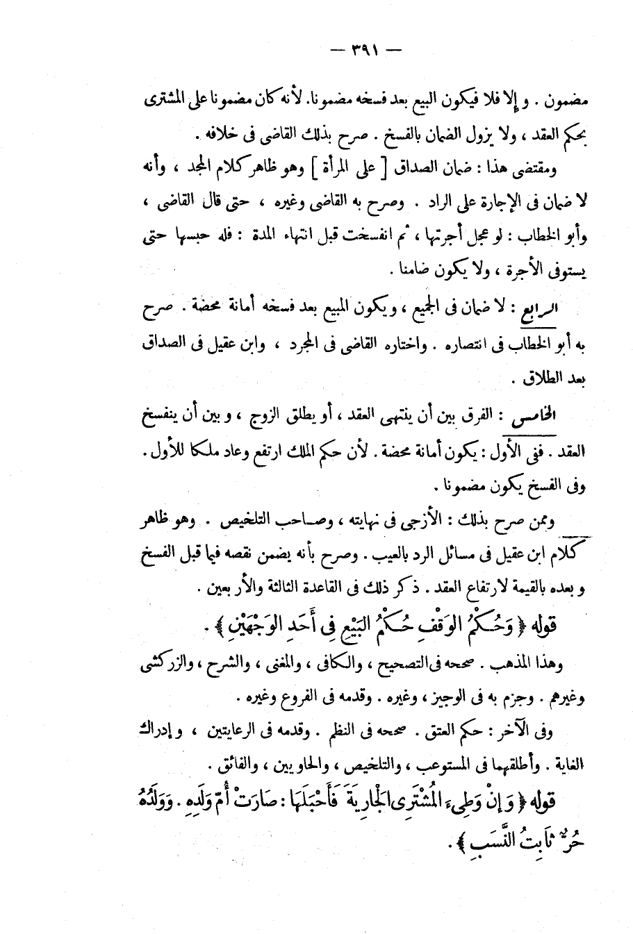 الْخَامِسُ: الْفَرْقُ بَيْنَ أَنْ يَنْتَهِيَ الْعَقْدُ، أَوْ يُطَلِّقُ الزَّوْجُ، وَبَيْنَ أَنْ يَنْفَسِخَ الْعَقْدُ. فِي الْأَوَّلِ: يَكُونُ أَمَانَةً مَحْضَةً. لِأَنَّ حُكْمَ الْمِلْكِ ارْتَفَعَ وَعَادَ مِلْكًا لِلْأَوَّلِ. وَفِي الْفَسْخِ يَكُونُ مَضْمُونًا. وَمِمَّنْ صَرَّحَ بِذَلِكَ: الْأَزَجِيُّ فِي نِهَايَتِهِ، وَصَاحِبُ التَّلْخِيصِ. وَهُوَ ظَاهِرُ كَلَامِ ابْنِ عَقِيلٍ فِي مَسَائِلِ الرَّدِّ بِالْعَيْبِ. وَصَرَّحَ بِأَنَّهُ يَضْمَنُ نَقْصَهُ فِيمَا قَبْلَ الْفَسْخِ وَبَعْدَهُ بِالْقِيمَةِ لِارْتِفَاعِ الْعَقْدِ. ذَكَرَ ذَلِكَ فِي الْقَاعِدَةِ الثَّالِثَةِ وَالْأَرْبَعِينَ. قَوْلُهُ (وَحُكْمُ الْوَقْفِ حُكْمُ الْبَيْعِ فِي أَحَدِ الْوَجْهَيْنِ) .