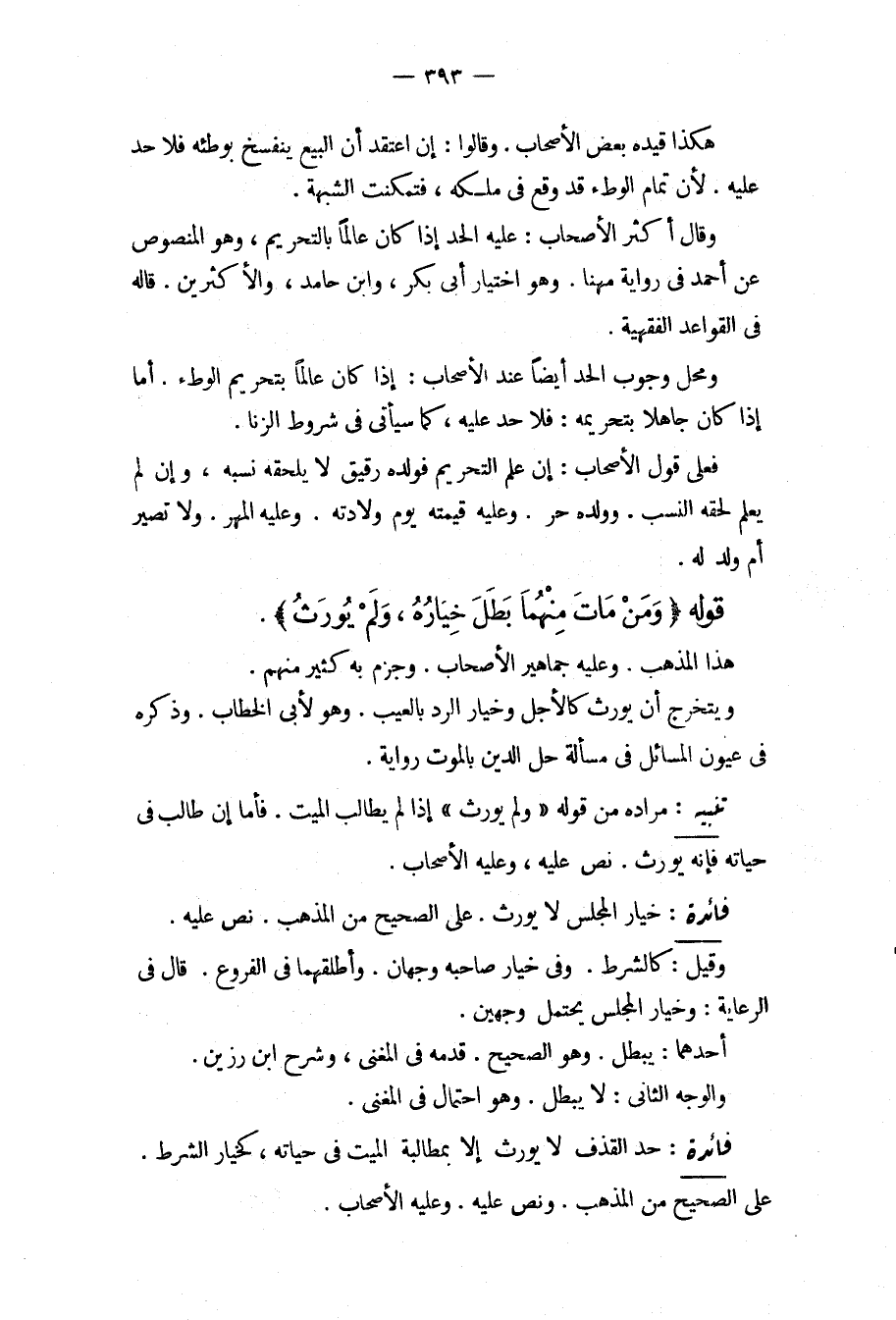 هَكَذَا قَيَّدَهُ بَعْضُ الْأَصْحَابِ. وَقَالُوا: إنْ اعْتَقَدَ أَنَّ الْبَيْعَ يَنْفَسِخُ بِوَطْئِهِ فَلَا حَدَّ عَلَيْهِ. لِأَنَّ تَمَامَ الْوَطْءِ قَدْ وَقَعَ فِي مِلْكِهِ، فَتَمَكَّنَتْ الشُّبْهَةُ. وَقَالَ أَكْثَرُ الْأَصْحَابِ: عَلَيْهِ الْحَدُّ إذَا كَانَ عَالِمًا بِالتَّحْرِيمِ، وَهُوَ الْمَنْصُوصُ عَنْ أَحْمَدَ فِي رِوَايَةِ مُهَنَّا. وَهُوَ اخْتِيَارُ أَبِي بَكْرٍ، وَابْنِ حَامِدٍ، وَالْأَكْثَرِينَ. قَالَهُ فِي الْقَوَاعِدِ الْفِقْهِيَّةِ. وَمَحَلُّ وُجُوبِ الْحَدِّ أَيْضًا عِنْدَ الْأَصْحَابِ: إذَا كَانَ عَالِمًا بِتَحْرِيمِ الْوَطْءِ. أَمَّا إذَا كَانَ جَاهِلًا بِتَحْرِيمِهِ: فَلَا حَدَّ عَلَيْهِ، كَمَا سَيَأْتِي فِي شُرُوطِ الزِّنَا. فَعَلَى قَوْلِ الْأَصْحَابِ: إنْ عَلِمَ التَّحْرِيمَ فَوَلَدُهُ رَقِيقٌ لَا يَلْحَقُهُ نَسَبُهُ، وَإِنْ لَمْ يَعْلَمْ لَحِقَهُ النَّسَبُ. وَوَلَدُهُ حُرٌّ. وَعَلَيْهِ قِيمَتُهُ يَوْمَ وِلَادَتِهِ. وَعَلَيْهِ الْمَهْرُ. وَلَا تَصِيرُ أُمَّ وَلَدٍ لَهُ. قَوْلُهُ (وَمَنْ مَاتَ مِنْهُمَا بَطَلَ خِيَارُهُ، وَلَمْ يُورَثْ) . هَذَا الْمَذْهَبُ. وَعَلَيْهِ جَمَاهِيرُ الْأَصْحَابِ. وَجَزَمَ بِهِ كَثِيرٌ مِنْهُمْ. وَيَتَخَرَّجُ أَنْ يُورَثَ كَالْأَجَلِ وَخِيَارِ الرَّدِّ بِالْعَيْبِ. وَهُوَ لِأَبِي الْخَطَّابِ. وَذَكَرَهُ فِي عُيُونِ الْمَسَائِلِ فِي مَسْأَلَةِ حَلِّ الدَّيْنِ بِالْمَوْتِ رِوَايَةً.