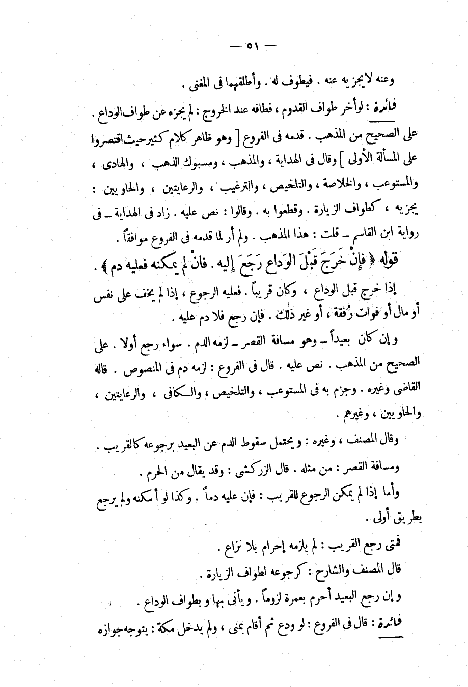 قَوْلُهُ (فَإِنْ خَرَجَ قَبْلَ الْوَدَاعِ رَجَعَ إلَيْهِ فَإِنْ لَمْ يُمْكِنْهُ فَعَلَيْهِ دَمٌ) إذَا خَرَجَ قَبْلَ الْوَدَاعِ، وَكَانَ قَرِيبًا فَعَلَيْهِ الرُّجُوعُ، إذَا لَمْ يَخَفْ عَلَى نَفْسٍ أَوْ مَالٍ أَوْ فَوَاتِ رُفْقَةٍ، أَوْ غَيْرِ ذَلِكَ فَإِنْ رَجَعَ فَلَا دَمَ عَلَيْهِ وَإِنْ كَانَ بَعِيدًا وَهُوَ مَسَافَةُ الْقَصْرِ لَزِمَهُ الدَّمُ سَوَاءٌ رَجَعَ أَوْ لَا عَلَى الصَّحِيحِ مِنْ الْمَذْهَبِ نَصَّ عَلَيْهِ قَالَ فِي الْفُرُوعِ: لَزِمَهُ دَمٌ فِي الْمَنْصُوصِ قَالَهُ الْقَاضِي وَغَيْرُهُ وَجَزَمَ بِهِ فِي الْمُسْتَوْعِبِ، وَالتَّلْخِيصِ، وَالْكَافِي، وَالرِّعَايَتَيْنِ، وَالْحَاوِيَيْنِ، وَغَيْرِهِمْ وَقَالَ الْمُصَنِّفُ، وَغَيْرُهُ: وَيُحْتَمَلُ سُقُوطُ الدَّمِ عَنْ الْبَعِيدِ بِرُجُوعِهِ كَالْقَرِيبِ، وَمَسَافَةُ الْقَصْرِ: مِنْ مِثْلِهِ قَالَ الزَّرْكَشِيُّ: وَقَدْ يُقَالُ مِنْ الْحَرَمِ وَأَمَّا إذَا لَمْ يُمْكِنْ الرُّجُوعُ لِلْقَرِيبِ: فَإِنَّ عَلَيْهِ دَمًا وَكَذَا لَوْ أَمْكَنَهُ وَلَمْ يَرْجِعْ بِطَرِيقِ أَوْلَى فَمَتَى رَجَعَ الْقَرِيبُ: لَمْ يَلْزَمْهُ إحْرَامٌ بِلَا نِزَاعٍ قَالَ الْمُصَنِّفُ وَالشَّارِحُ: كَرُجُوعِهِ لِطَوَافِ الزِّيَارَةِ وَإِنْ رَجَعَ الْبَعِيدُ أَحْرَمَ بِعُمْرَةٍ لُزُومًا وَيَأْتِي بِهَا وَبِطَوَافِ الْوَدَاعِ