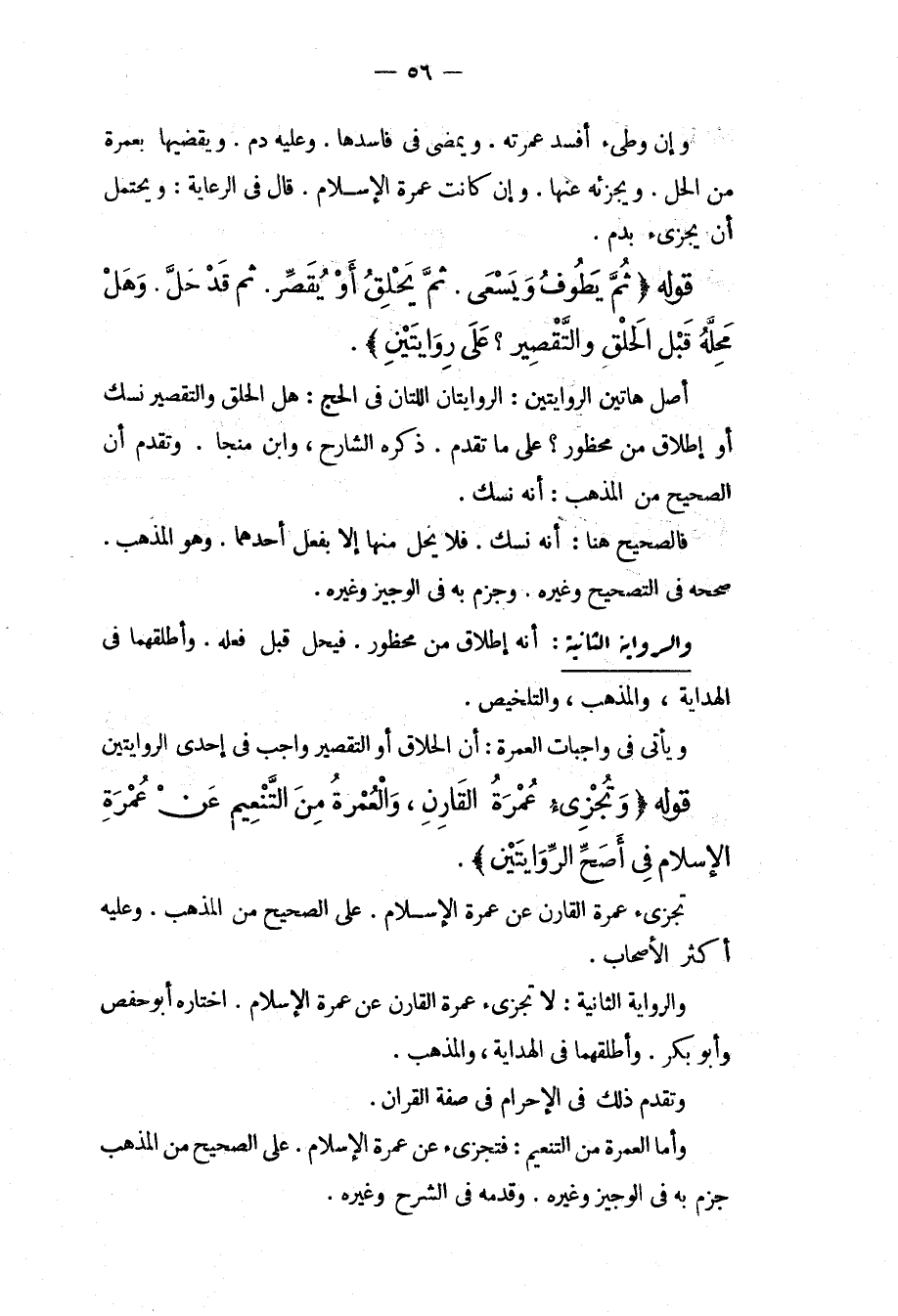وَالرِّوَايَةُ الثَّانِيَةُ: أَنَّهُ إطْلَاقٌ مِنْ مَحْظُورٍ فَيَحِلُّ قَبْلَ فِعْلِهِ وَأَطْلَقَهُمَا فِي الْهِدَايَةِ، وَالْمُذْهَبِ، وَالتَّلْخِيصِ وَيَأْتِي فِي وَاجِبَاتِ الْعُمْرَةِ: أَنَّ الْحِلَاقَ أَوْ التَّقْصِيرَ وَاجِبٌ فِي إحْدَى الرِّوَايَتَيْنِ قَوْلُهُ (وَتُجْزِئُ عُمْرَةُ الْقَارِنِ، وَالْعُمْرَةُ مِنْ التَّنْعِيمِ عَنْ عُمْرَةِ الْإِسْلَامِ فِي أَصَحِّ الرِّوَايَتَيْنِ) تُجْزِئُ عُمْرَةُ الْقَارِنِ عَنْ عُمْرَةِ الْإِسْلَامِ عَلَى الصَّحِيحِ مِنْ الْمَذْهَبِ وَعَلَيْهِ أَكْثَرُ الْأَصْحَابِ