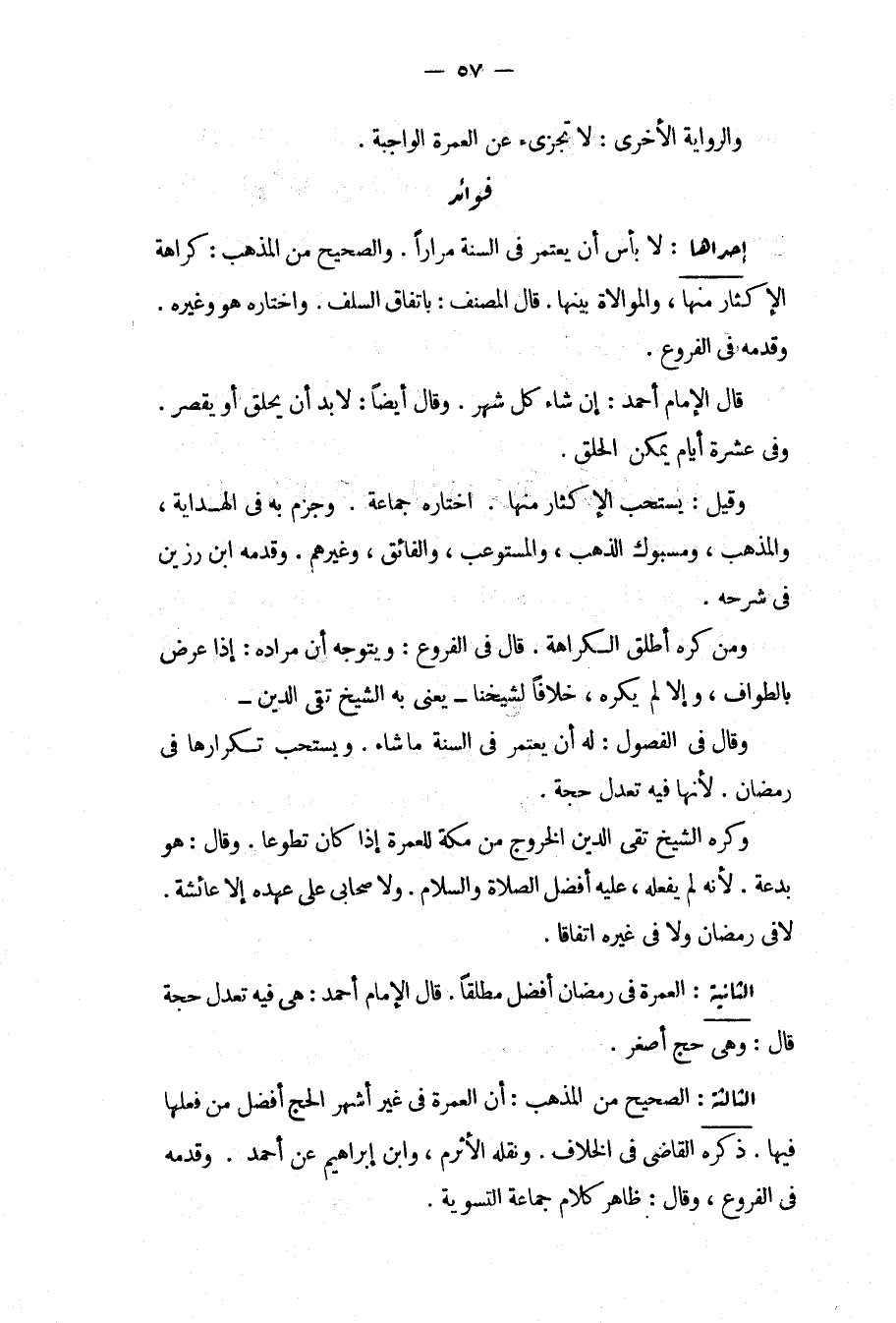 وَقَدَّمَهُ فِي الْفُرُوعِ قَالَ الْإِمَامُ أَحْمَدُ: إنْ شَاءَ كُلَّ شَهْرٍ وَقَالَ أَيْضًا: لَا بُدَّ أَنْ يَحْلِقَ أَوْ يُقَصِّرَ وَفِي عَشَرَةِ أَيَّامٍ يُمْكِنُ الْحَلْقُ وَقِيلَ: يُسْتَحَبُّ الْإِكْثَارُ مِنْهَا اخْتَارَهُ جَمَاعَةٌ وَجَزَمَ بِهِ فِي الْهِدَايَةِ، وَالْمُذْهَبِ، وَمَسْبُوكِ الذَّهَبِ، وَالْمُسْتَوْعِبِ، وَالْفَائِقِ، وَغَيْرِهِمْ وَقَدَّمَهُ ابْنُ رَزِينٍ فِي شَرْحِهِ وَمَنْ كَرِهَ أَطْلَقَ الْكَرَاهَةَ قَالَ فِي الْفُرُوعِ: وَيَتَوَجَّهُ أَنَّ مُرَادَهُ: إذَا عَرَضَ بِالطَّوَافِ، وَإِلَّا لَمْ يُكْرَهْ، خِلَافًا لِشَيْخِنَا يَعْنِي بِهِ الشَّيْخَ تَقِيَّ الدِّينِ وَقَالَ فِي الْفُصُولِ: لَهُ أَنْ يَعْتَمِرَ فِي السَّنَةِ مَا شَاءَ وَيُسْتَحَبُّ تَكْرَارُهَا فِي رَمَضَانَ لِأَنَّهَا فِيهِ تَعْدِلُ حَجَّةً وَكَرِهَ الشَّيْخُ تَقِيُّ الدِّينِ الْخُرُوجَ مِنْ مَكَّةَ لِلْعُمْرَةِ إذَا كَانَ تَطَوُّعًا، وَقَالَ: هُوَ بِدْعَةٌ لِأَنَّهُ لَمْ يَفْعَلْهُ، عَلَيْهِ أَفْضَلُ الصَّلَاةِ وَالسَّلَامِ وَلَا صَحَابِيٌّ عَلَى عَهْدِهِ إلَّا عَائِشَةَ