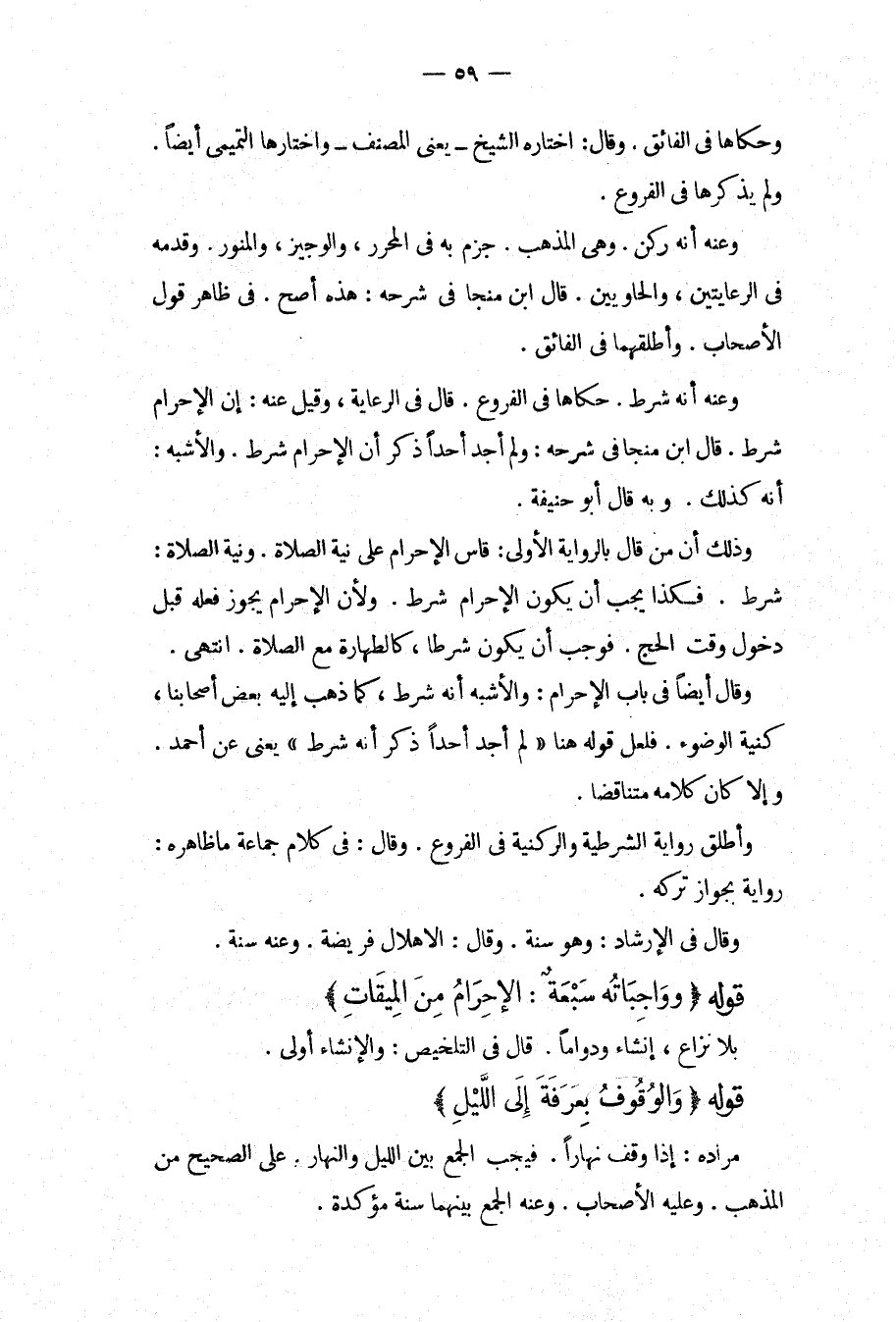 وَحَكَاهَا فِي الْفَائِقِ وَقَالَ: اخْتَارَهُ الشَّيْخُ يَعْنِي الْمُصَنِّفَ وَاخْتَارَهَا التَّمِيمِيُّ أَيْضًا وَلَمْ يَذْكُرْهَا فِي الْفُرُوعِ وَعَنْهُ أَنَّهُ رُكْنٌ وَهِيَ الْمَذْهَبُ جَزَمَ بِهِ فِي الْمُحَرَّرِ، وَالْوَجِيزِ، وَالْمُنَوِّرِ وَقَدَّمَهُ فِي الرِّعَايَتَيْنِ، وَالْحَاوِيَيْنِ قَالَ ابْنُ مُنَجَّا فِي شَرْحِهِ: هَذِهِ أَصَحُّ فِي ظَاهِرِ قَوْلِ الْأَصْحَابِ وَأَطْلَقَهُمَا فِي الْفَائِقِ وَعَنْهُ أَنَّهُ شَرْطٌ حَكَاهَا فِي الْفُرُوعِ قَالَ فِي الرِّعَايَةِ، وَقِيلَ عَنْهُ: إنَّ الْإِحْرَامَ شَرْطٌ قَالَ ابْنُ مُنَجَّا فِي شَرْحِهِ: وَلَمْ أَجِدْ أَحَدًا ذَكَرَ أَنَّ الْإِحْرَامَ شَرْطٌ وَالْأَشْبَهُ: أَنَّهُ كَذَلِكَ وَبِهِ قَالَ أَبُو حَنِيفَةَ وَذَلِكَ أَنَّ مَنْ قَالَ بِالرِّوَايَةِ الْأُولَى: قَاسَ الْإِحْرَامَ عَلَى نِيَّةِ الصَّلَاةِ وَنِيَّةُ الصَّلَاةِ: شَرْطٌ فَكَذَا يَجِبُ أَنْ يَكُونَ الْإِحْرَامُ شَرْطًا وَلِأَنَّ الْإِحْرَامَ يَجُوزُ فِعْلُهُ قَبْلَ دُخُولِ وَقْتِ الْحَجِّ فَوَجَبَ أَنْ يَكُونَ شَرْطًا، كَالطَّهَارَةِ مَعَ الصَّلَاةِ انْتَهَى.