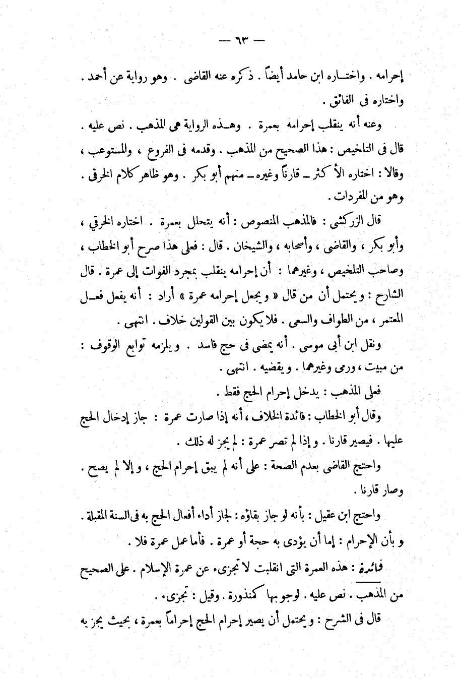 إحْرَامُهُ وَاخْتَارَهُ ابْنُ حَامِدٍ أَيْضًا ذَكَرَهُ عَنْهُ الْقَاضِي وَهُوَ رِوَايَةٌ عَنْ أَحْمَدَ وَاخْتَارَهُ فِي الْفَائِقِ وَعَنْهُ أَنَّهُ يَنْقَلِبُ إحْرَامُهُ بِعُمْرَةٍ وَهَذِهِ الرِّوَايَةُ هِيَ الْمَذْهَبُ نَصَّ عَلَيْهِ قَالَ فِي التَّلْخِيصِ: هَذَا الصَّحِيحُ مِنْ الْمَذْهَبِ وَقَدَّمَهُ فِي الْفُرُوعِ، وَالْمُسْتَوْعِبِ، وَقَالَا: اخْتَارَهُ الْأَكْثَرُ قَارِنًا وَغَيْرَهُ مِنْهُمْ أَبُو بَكْرٍ وَهُوَ ظَاهِرُ كَلَامِ الْخِرَقِيُّ وَهُوَ مِنْ الْمُفْرَدَاتِ قَالَ الزَّرْكَشِيُّ: فَالْمَذْهَبُ الْمَنْصُوصُ: أَنَّهُ تَحَلَّلَ بِعُمْرَةٍ اخْتَارَهُ الْخِرَقِيُّ، وَأَبُو بَكْرٍ، وَالْقَاضِي، وَأَصْحَابُهُ، وَالشَّيْخَانِ قَالَ: فَعَلَى هَذَا صَرَّحَ أَبُو الْخَطَّابِ، وَصَاحِبُ التَّلْخِيصِ، وَغَيْرُهُمَا: أَنَّ إحْرَامَهُ يَنْقَلِبُ بِمُجَرَّدِ الْفَوَاتِ إلَى عُمْرَةٍ قَالَ الشَّارِحُ: وَيَحْتَمِلُ أَنَّ مَنْ قَالَ " وَيُجْعَلُ إحْرَامُهُ عُمْرَةً " أَرَادَ: أَنَّهُ يَفْعَلُ فِعْلَ الْمُعْتَمِرِ، مِنْ الطَّوَافِ وَالسَّعْيِ فَلَا يَكُونُ بَيْنَ الْقَوْلَيْنِ خِلَافٌ انْتَهَى.