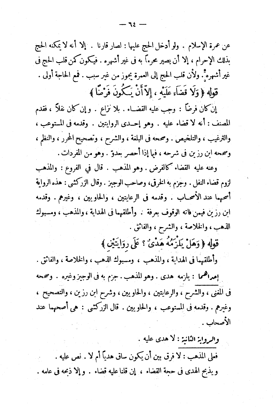 عَنْ عُمْرَةِ الْإِسْلَامِ وَلَوْ أَدْخَلَ الْحَجَّ عَلَيْهَا: لَصَارَ قَارِنًا إلَّا أَنَّهُ لَا يُمْكِنُهُ الْحَجُّ بِذَلِكَ الْإِحْرَامِ، إلَّا أَنْ يَصِيرَ مُحَرَّمًا بِهِ فِي غَيْرِ أَشْهُرِهِ فَيَكُونُ كَمَنْ قَلَبَ الْحَجَّ فِي غَيْرِ أَشْهُرِهِ وَلِأَنَّ قَلْبَ الْحَجِّ إلَى الْعُمْرَةِ يَجُوزُ مِنْ غَيْرِ سَبَبٍ فَمَعَ الْحَاجَةِ أَوْلَى قَوْلُهُ (وَلَا قَضَاءَ عَلَيْهِ، إلَّا أَنْ يَكُونَ فَرْضًا) إنْ كَانَ فَرْضًا: وَجَبَ عَلَيْهِ الْقَضَاءُ بِلَا نِزَاعٍ وَإِنْ كَانَ نَفْلًا، فَقَدَّمَ الْمُصَنِّفُ: أَنَّهُ لَا قَضَاءَ عَلَيْهِ وَهُوَ إحْدَى الرِّوَايَتَيْنِ وَقَدَّمَهُ فِي الْمُسْتَوْعِبِ، وَالتَّرْغِيبِ، وَالتَّلْخِيصِ وَصَحَّحَهُ فِي الْبُلْغَةِ، وَالشَّرْحِ، وَتَصْحِيحِ الْمُحَرَّرِ، وَالنَّظْمِ، وَصَحَّحَهُ ابْنُ رَزِينٍ فِي شَرْحِهِ، فِيمَا إذَا أُحْصِرَ بِعَدُوٍّ وَهُوَ مِنْ الْمُفْرَدَاتِ وَعَنْهُ عَلَيْهِ الْقَضَاءُ كَالْفَرْضِ وَهُوَ الْمَذْهَبُ قَالَ فِي الْفُرُوعِ: وَالْمَذْهَبُ لُزُومُ قَضَاءِ النَّفْلِ وَجَزَمَ بِهِ الْخِرَقِيُّ، وَصَاحِبُ الْوَجِيزِ وَقَالَ الزَّرْكَشِيُّ: هَذِهِ الرِّوَايَةُ أَصَحُّهُمَا عِنْدَ الْأَصْحَابِ وَقَدَّمَهُ فِي الرِّعَايَتَيْنِ، وَالْحَاوِيَيْنِ، وَغَيْرِهِمْ وَقَدَّمَهُ ابْنُ رَزِينٍ فِيمَنْ فَاتَهُ الْوُقُوفُ بِعَرَفَةَ وَأَطْلَقَهُمَا فِي الْهِدَايَةِ، وَالْمُذْهَبِ، وَمَسْبُوكِ الذَّهَبِ، وَالْخُلَاصَةِ، وَالشَّرْحِ، وَالْفَائِقِ قَوْلُهُ (وَهَلْ يَلْزَمُهُ هَدْيٌ؟ عَلَى رِوَايَتَيْنِ) وَأَطْلَقَهُمَا فِي الْهِدَايَةِ، وَالْمُذْهَبِ، وَمَسْبُوكِ الذَّهَبِ، وَالْخُلَاصَةِ، وَالْفَائِقِ إحْدَاهُمَا: