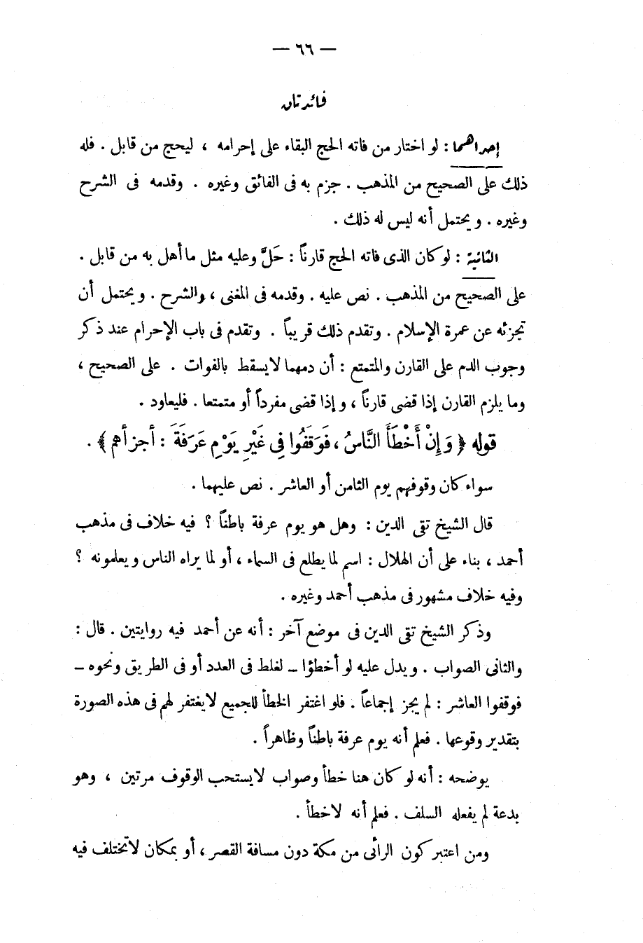 قَوْلُهُ (وَإِنْ أَخْطَأَ النَّاسُ، فَوَقَفُوا فِي غَيْرِ يَوْمِ عَرَفَةَ: أَجْزَأَهُمْ) سَوَاءٌ كَانَ وُقُوفُهُمْ يَوْمَ الثَّامِنِ أَوْ الْعَاشِرِ نَصَّ عَلَيْهِمَا قَالَ الشَّيْخُ تَقِيُّ الدِّينِ: وَهَلْ هُوَ يَوْمُ عَرَفَةَ بَاطِنًا؟ فِيهِ خِلَافٌ فِي مَذْهَبِ أَحْمَدَ، بِنَاءً عَلَى أَنَّ الْهِلَالَ: اسْمٌ لَمَا يَطْلُعُ فِي السَّمَاءِ، أَوْ لِمَا يَرَاهُ النَّاسُ وَيَعْلَمُونَهُ؟ وَفِيهِ خِلَافٌ مَشْهُورٌ فِي مَذْهَبِ أَحْمَدَ وَغَيْرِهِ وَذَكَرَ الشَّيْخُ تَقِيُّ الدِّينِ فِي مَوْضِعٍ آخَرَ: أَنَّهُ عَنْ أَحْمَدَ فِيهِ رِوَايَتَيْنِ قَالَ: وَالثَّانِي الصَّوَابُ وَيَدُلُّ عَلَيْهِ لَوْ أَخْطَئُوا لِغَلَطٍ فِي الْعَدَدِ أَوْ فِي الطَّرِيقِ وَنَحْوِهِ فَوَقَفُوا الْعَاشِرَ: لَمْ يُجْزِ إجْمَاعًا فَلَوْ اُغْتُفِرَ الْخَطَأُ لِلْجَمِيعِ لَا يُغْتَفَرُ لَهُمْ فِي هَذِهِ الصُّورَةِ بِتَقْدِيرِ وُقُوعِهَا فَعُلِمَ أَنَّهُ يَوْمُ عَرَفَةَ بَاطِنًا وَظَاهِرًا يُوَضِّحُهُ: أَنَّهُ لَوْ كَانَ هُنَا خَطَأٌ وَصَوَابٌ لَا يُسْتَحَبُّ الْوُقُوفُ مَرَّتَيْنِ، وَهُوَ بِدْعَةٌ لَمْ يَفْعَلْهُ السَّلَفُ فَعُلِمَ أَنَّهُ لَا خَطَأَ وَمَنْ اعْتَبَرَ كَوْنَ الرَّائِي مِنْ مَكَّةَ دُونَ مَسَافَةِ الْقَصْرِ، أَوْ بِمَكَانٍ لَا تَخْتَلِفُ فِيهِ