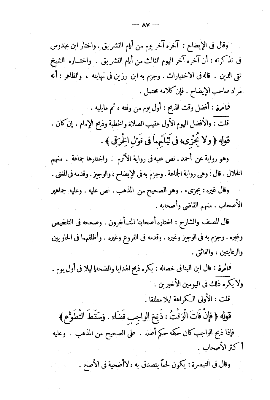 : قَالَ ابْنُ الْبَنَّا فِي خِصَالِهِ: يُكْرَهُ ذَبْحُ الْهَدَايَا وَالضَّحَايَا لَيْلًا فِي أَوَّلِ يَوْمٍ وَلَا يُكْرَهُ ذَلِكَ فِي الْيَوْمَيْنِ الْأَخِيرِينَ قُلْت: الْأَوْلَى الْكَرَاهَةُ لَيْلًا مُطْلَقًا قَوْلُهُ (فَإِنْ فَاتَ الْوَقْتُ: ذَبَحَ الْوَاجِبَ قَضَاءً وَسَقَطَ التَّطَوُّعَ) فَإِذَا ذَبَحَ الْوَاجِبَ كَانَ حُكْمُهُ حُكْمَ أَصْلِهِ عَلَى الصَّحِيحِ مِنْ الْمَذْهَبِ وَعَلَيْهِ أَكْثَرُ الْأَصْحَابِ وَقَالَ فِي التَّبْصِرَةِ: يَكُونُ لَحْمًا يَتَصَدَّقُ بِهِ، لَا أُضْحِيَّةً فِي الْأَصَحِّ