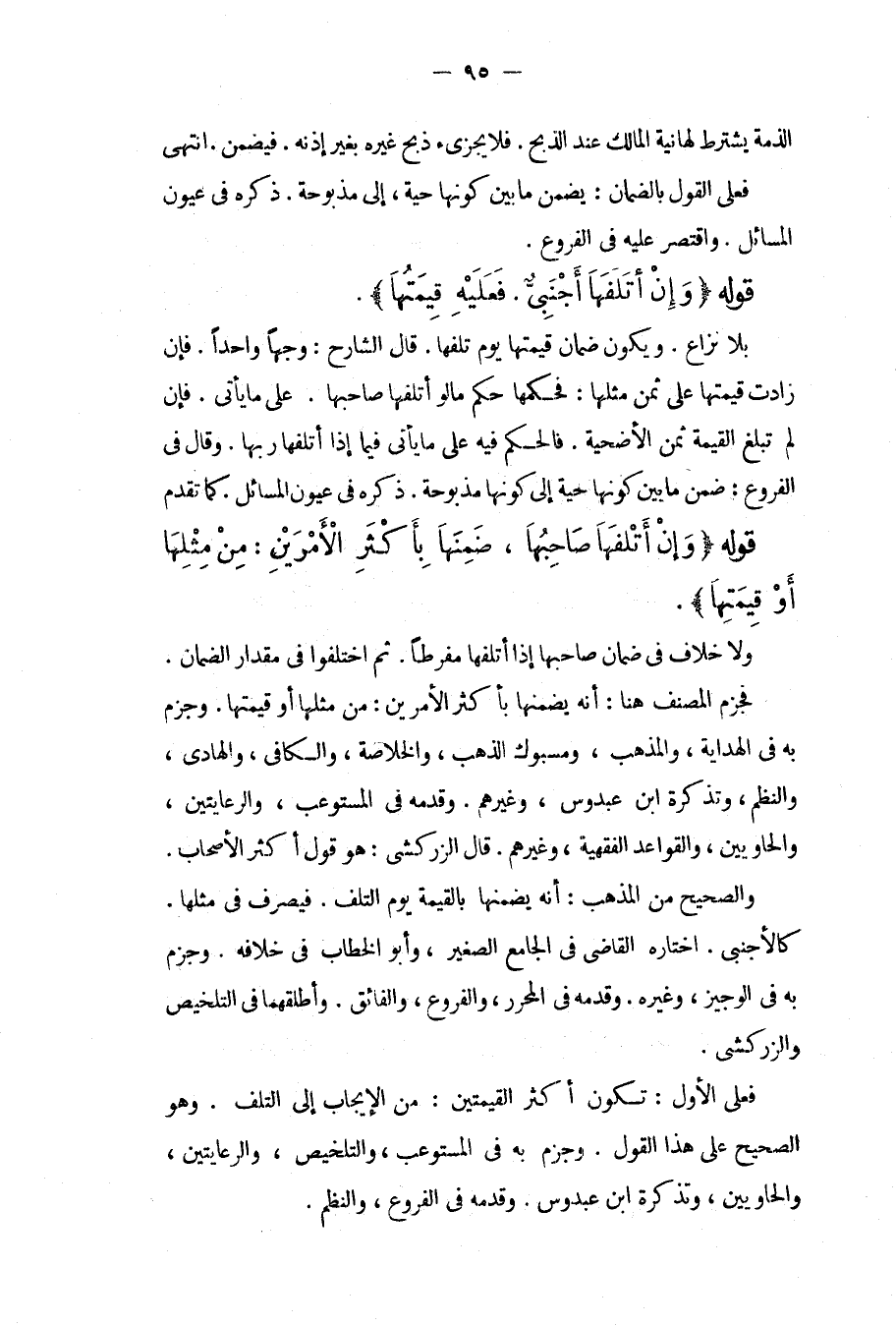 الذِّمَّةِ يُشْتَرَطُ لَهَا نِيَّةُ الْمَالِكِ عِنْدَ الذَّبْحِ فَلَا يُجْزِئُ ذَبْحُ غَيْرِهِ بِغَيْرِ إذْنِهِ فَيَضْمَنُ انْتَهَى فَعَلَى الْقَوْلِ بِالضَّمَانِ: يَضْمَنُ مَا بَيْنَ كَوْنِهَا حَيَّةً، إلَى مَذْبُوحَةً ذَكَرَهُ فِي عُيُونِ الْمَسَائِلِ وَاقْتَصَرَ عَلَيْهِ فِي الْفُرُوعِ