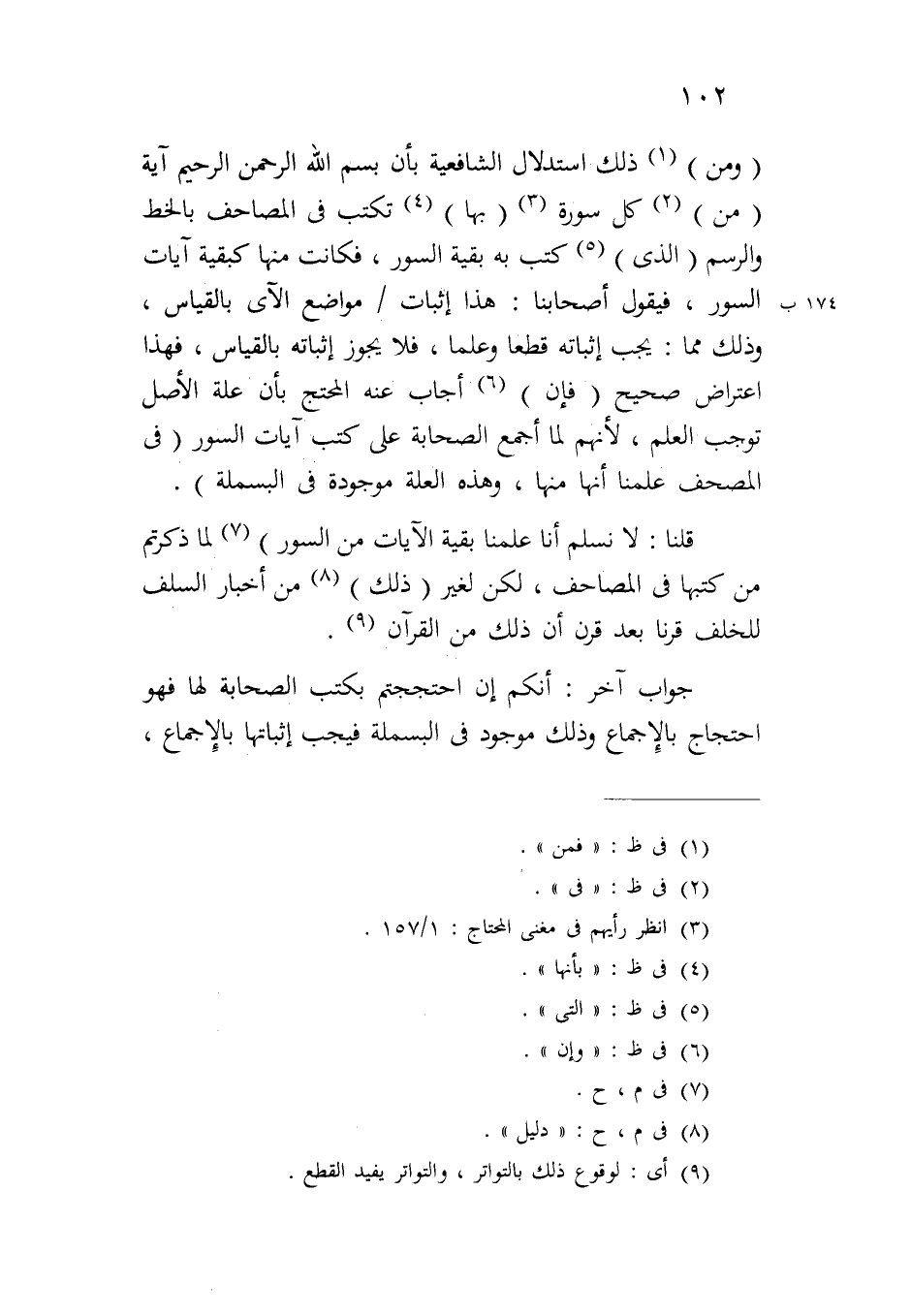 (ومن) ذلك استدلال الشافعية بأن بسم الله الرحمن الرحيم آية (من) كل سورة (بها) تكتب في المصاحف بالخط والرسم (الذي) كتب به بقية السور، فكانت منها كبقية آيات السور، فيقول أصحابنا: هذا إثبات/١٧٤ ب مواضع الآي بالقياس، وذلك مما: يجب إثباته قطعاً وعلماً، فلا يجوز إثباته بالقياس، فهذا اعتراض صحيح (فإن) أجاب عنه المحتج بأن علة الأصل توجب العلم، لأنهم لما أجمع الصحابة على كتب آيات السور (في المصحف علمنا أنها منها، وهذه العلة موجودة في البسملة).
