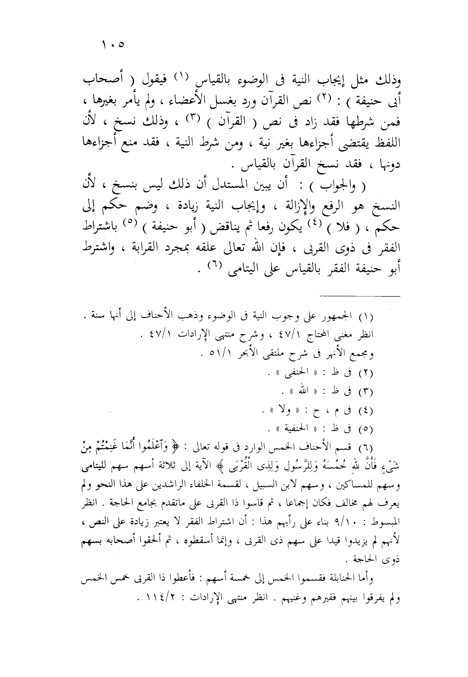 (والجواب): أن يبين المستدل أن ذلك ليس بنسخ، لأن النسخ هو الرفع والإزالة، وإيجاب النية زيادة، وضم حكم إلى حكم، (فلا) يكون رفعاً ثم يناقض (أبو حنيفة) باشتراط الفقر في ذوي القربى، فإن الله تعالى علقه بمجرد القرابة، واشترط أبو حنيفة الفقر بالقياس على اليتامى.