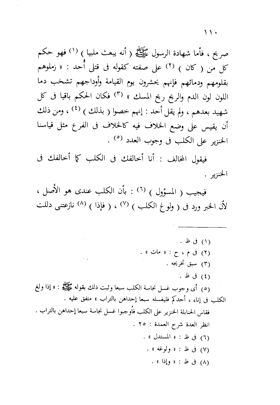 صريح، فأما شهادة الرسول صلى الله عليه وسلم (أنه يبعث ملبياً) فهو حكم كل من (كان) على صفته كقوله في قتلى أحد: "زملوهم بقلومهم ودمائهم فإنهم يحشرون يوم القيامة وأوداجهم تشخب دماً اللون لون الدم والريح ريح المسك" فكان الحكم باقياً ف يكل شهيد بعدهم، ولم يقل أحد: إنهم خصوا (بذلك)، ومن ذلك أن يقيس على وضع الخلاف فيه كالخلاف في الفرع مثل قياسنا الخنزير على الكلب في وجوب العدد.
