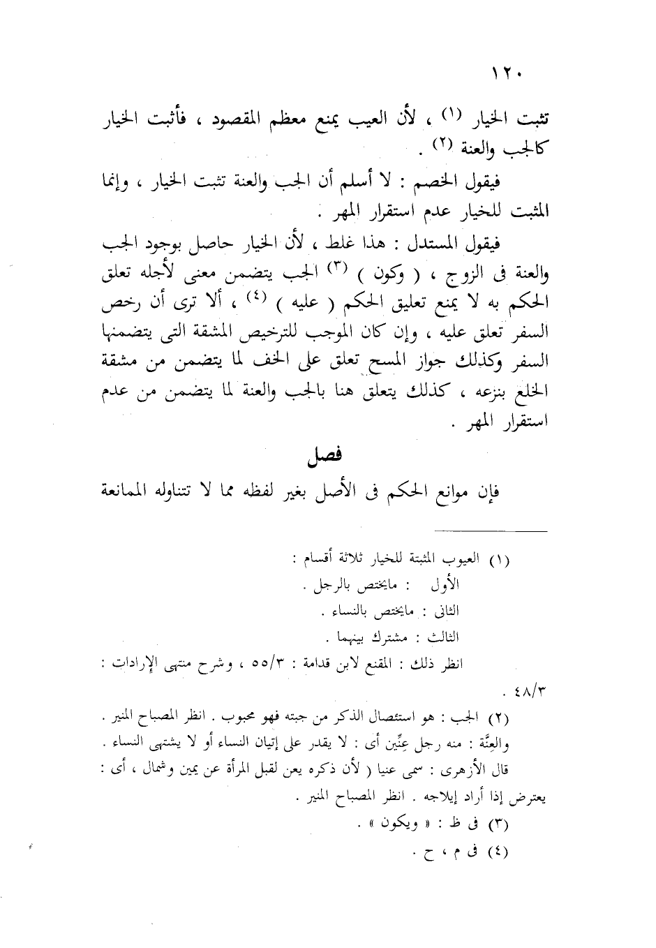 فيقول المستدل: هذا غلط، لأن الخيار حاصل بوجود الجب والعنة في الزوج، (وكون) الجب يتضمن معنى لأجله تعلق الحكم به لا يمنع تعليق الحكم (عليه)، ألا ترى أن رخص السفر تعلق عليه، وإن كان الموجب للترخيص المشقة التي يتضمنها السفر وكذلك جواز المسح تعلق على الخف لما يتضمن من مشقة الخلع بنزعه، كذلك يتعلق هنا بالجب والعنة لما يتضمن من عدم استقرار المهر.