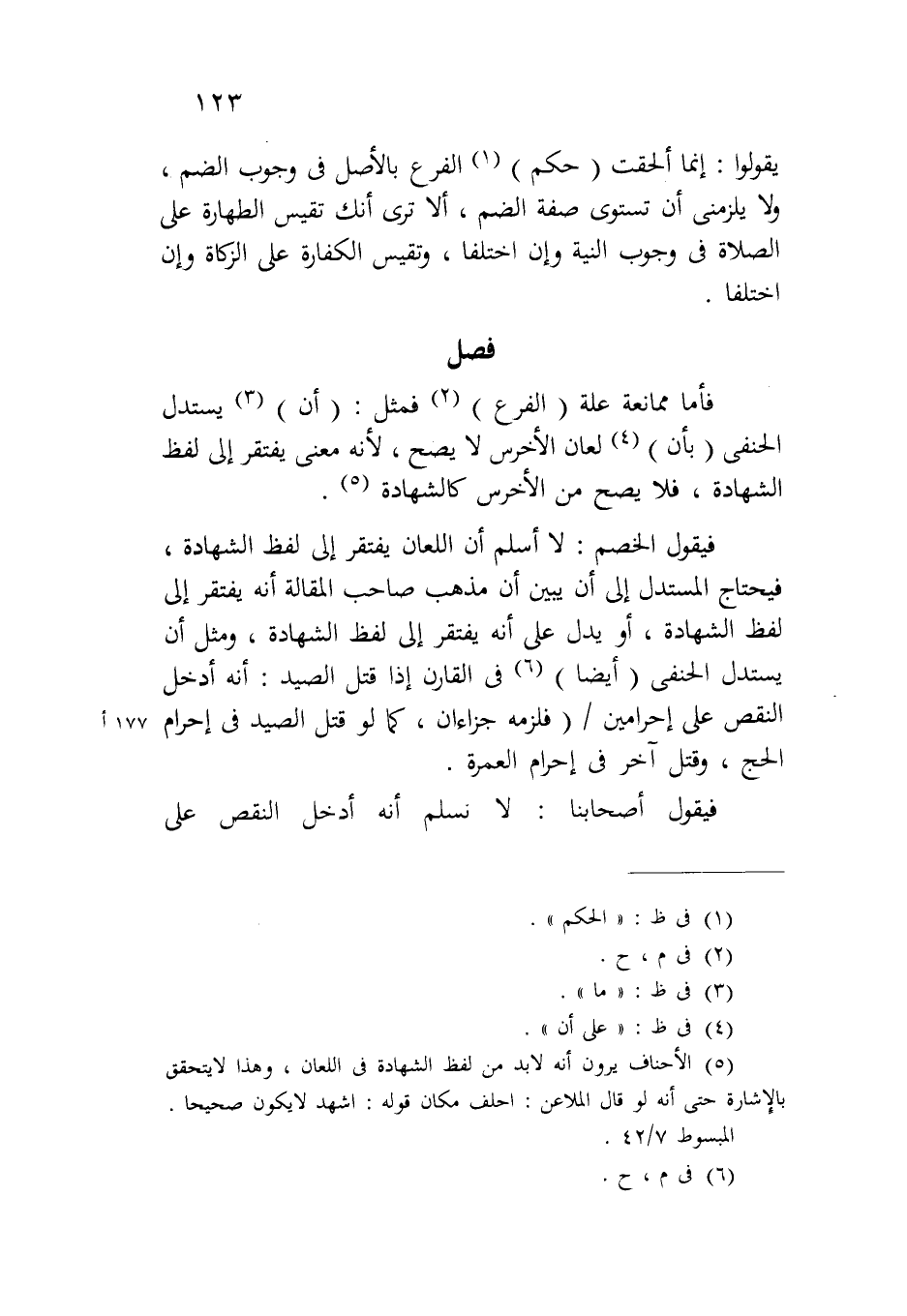 فيقول الخصم: لا أسلم أن اللعان يفتقر إلى لفظ الشهادة، فيحتاج المستدل إلى أن يبين أن مذهب صاحب المقالة أنه يفتقر إلى لفظ الشهادة، أو يدل على أنه يفتقر إلى لفظ الشهادة، ومثل أن يستدل الحنفي (أيضاً) في القارن إذا قتل الصيد: أنه أدخل النقص على إحرامين/١٧٧ أ (فلزمه جزاءان، كما لو قتل الصيد في إحرام الحج، وقتل آخر في إحرام العمرة.