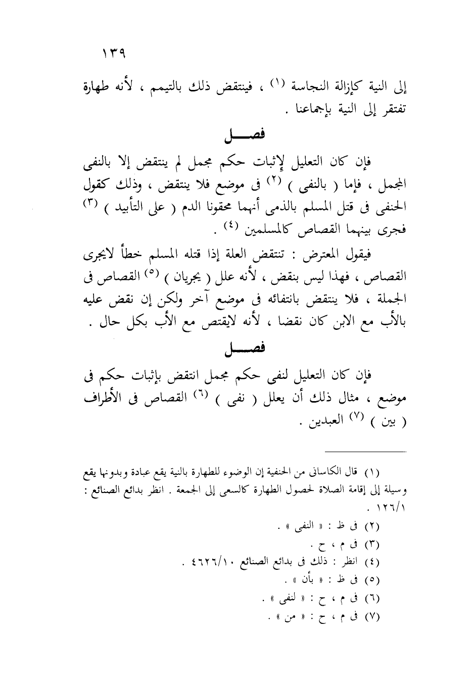 فإن كان التعليل لإثبات حكم مجمل لم ينتقض إليه بالنفي المجمل، فإما (بالنفي) في موضع فلا ينتقض، وذلك كقول الحنفي في قتل المسلم بالذمي أنهما محقوناً الدم (على التأبيد) فجرى بينهما القصاص كالمسلمين.