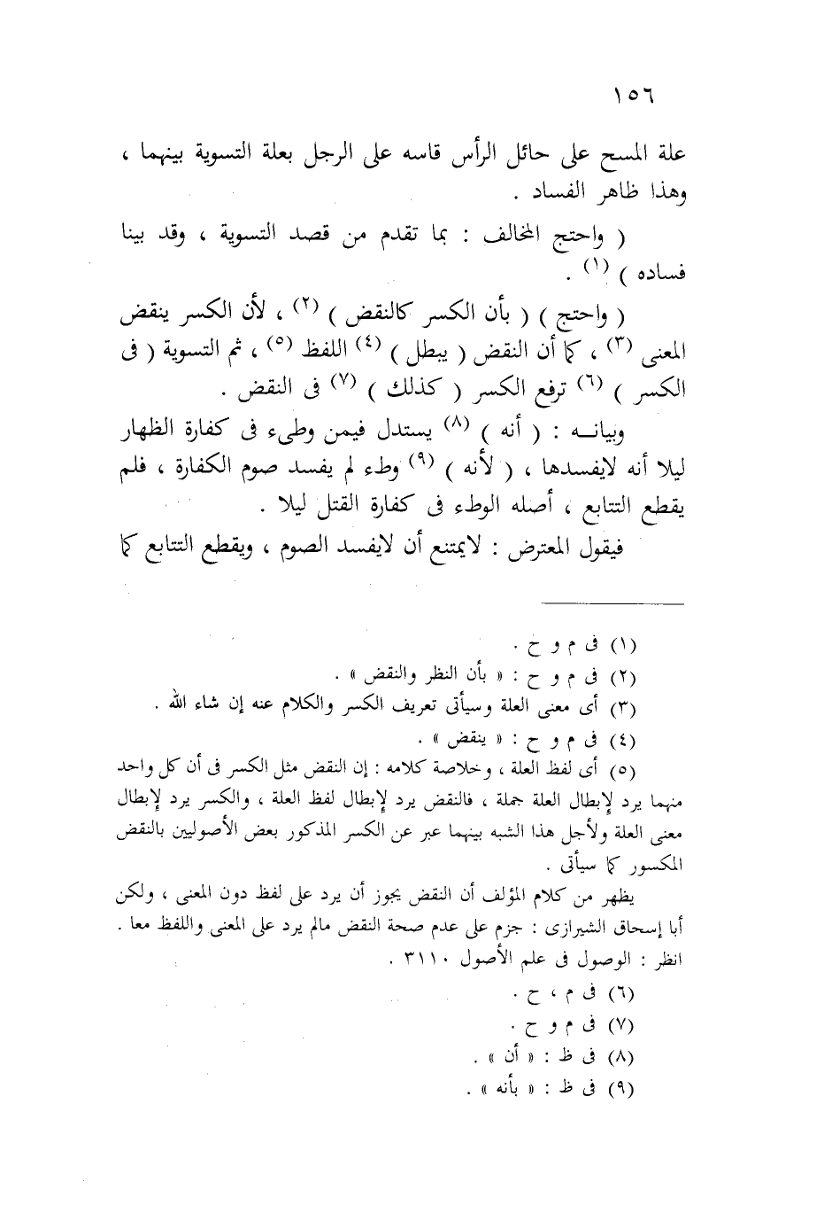 علة المسح على حائل الرأس قاسه على الرجل بعلة التسوية بينهما، وهذا ظاهر الفساد.