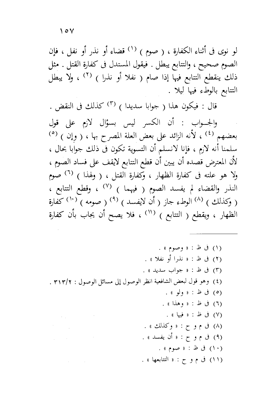 والجواب: أن الكسر ليس بسؤال لازم على قول بعضهم، لأنه الزائد على بضع العلة المصرح بها، (وإن) سلمنا أنه لازم، فإنا لا نسلم أن التسوية تكون في ذلك جواباً بحال، لأن المعترض قصده أن يبين أن قطع التتابع لا يقف على فساد الصوم، ولا هو علته في كفارة الظهار، وكفارة القتل، (ولهذا) صوم النذر والقضاء لم يفسد الصوم (فيهما)، وقطع التتابع، (وكذلك) الوطء جاز (أن لا يفسد) (صومه) كفارة الظهار، ويقطع (التتابع)، فلا يصح أن يجاب بأن كفارة