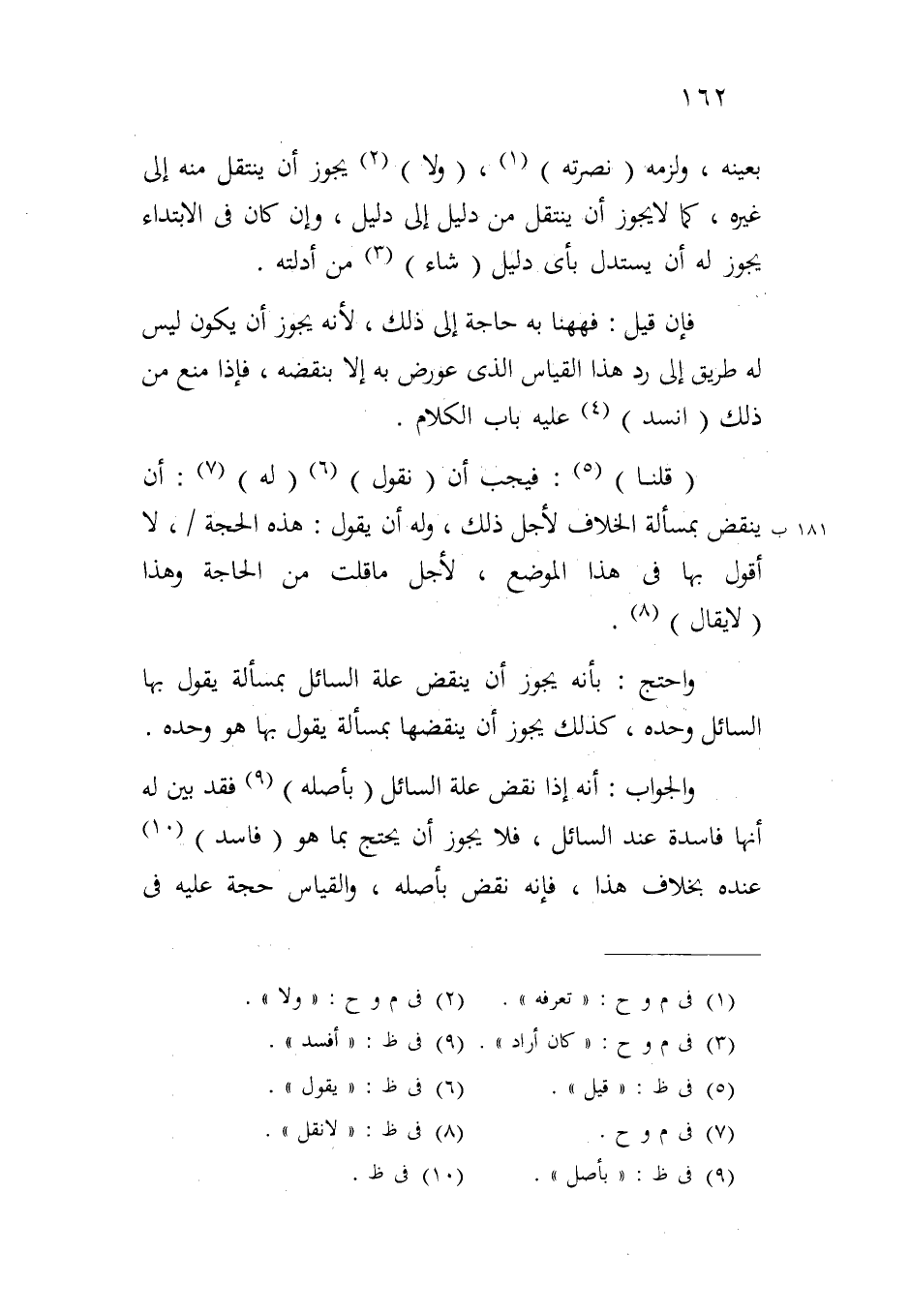 واحتج: بأنه يجوز أن ينقض علة السائل بمسألة يقول بها السائل وحده، كذلك يجوز أن ينقضها بمسألة يقول بها هو وحده.