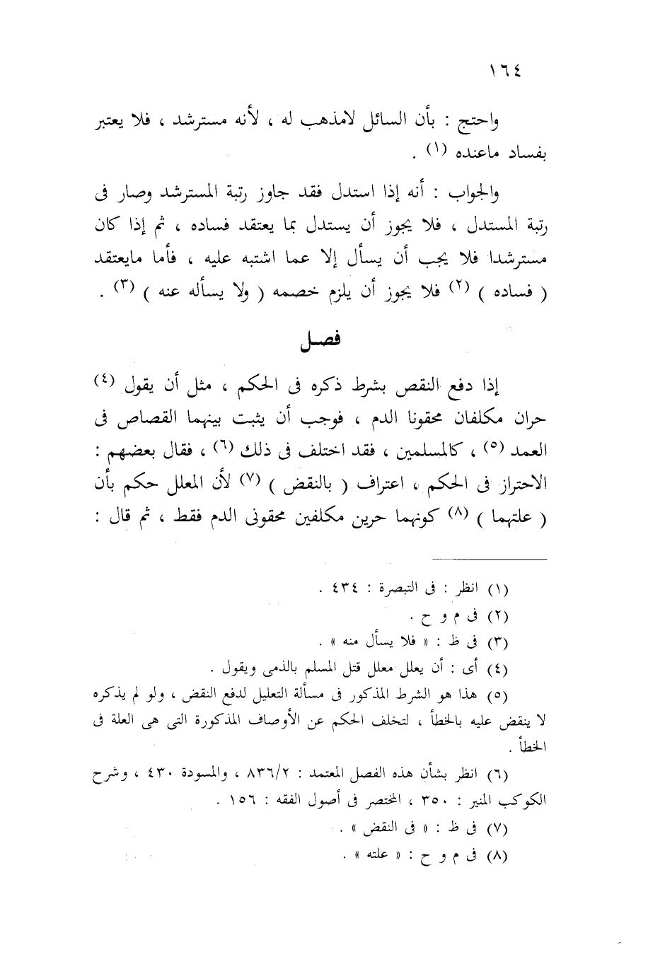 والجواب: أنه إذا استدل فقد جاوز رتبة المسترشد وصار في رتبة المستدل، فلا يجوز أن يستدل بما يعتقد فساده، ثم إذا كان مسترشداً فلا يجب أن يسأل إلا عما اشتبه عليه، فأما ما يعتقد (فساد) فلا يجوز أن يلزم خصمه (ولا يسأله عنه).
