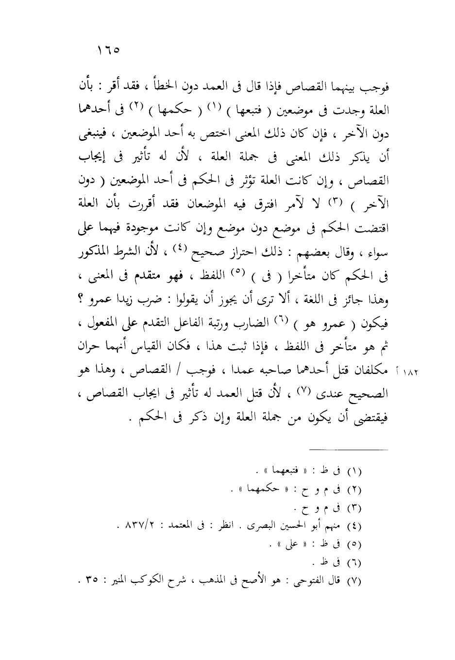 فوجب بينهما القصاص فإذا قال في العمد دون الخطأ، فقد أقر: بأن العلة وجدت في موضعين (فتبعها) (حكمها) في أحدهما دون الآخر، فإن كان ذلك المعنى اختص به أحد الموضعين، فينبغي أن يذكر ذلك المعنى في جملة العلة، لأن له تأثير في إيجاب القصاص، وإن كانت العلة تؤثر في الحكم في أحد الموضعين (دون الآخر) لا لآمر افترق فيه الموضعان فقد أقررت بأن العلة اقتضت الحكم في موضع دون موضع وإن كانت موجودة فيهما على سواء، وقال بعضهم: ذلك احتراز صحيح، لأن الشرط المذكور في الحكم كان متأخراً (في) اللفظ، فهو متقدم في المعنى، وهذا جائز في اللغة، ألا ترى أن يجوز أن يقولوا: ضرب زيداً عمرو؟ فيكون (عمرو هو) الضارب ورتبة الفاعل التقدم على المفعول، ثم هو متأخر في اللفظ، فإذا ثبت هذا، فكان القياس أنهما حران مكلفان قتل أحدهما صاحبه عمداً، فوجب/١٨٢ أالقصاص، وهذا هو الصحيح عندي، لأن قتل العمد له تأثير في إيجاب القصاص، فيقتضي أن يكون من جملة العلة وإن ذكر في الحكم.