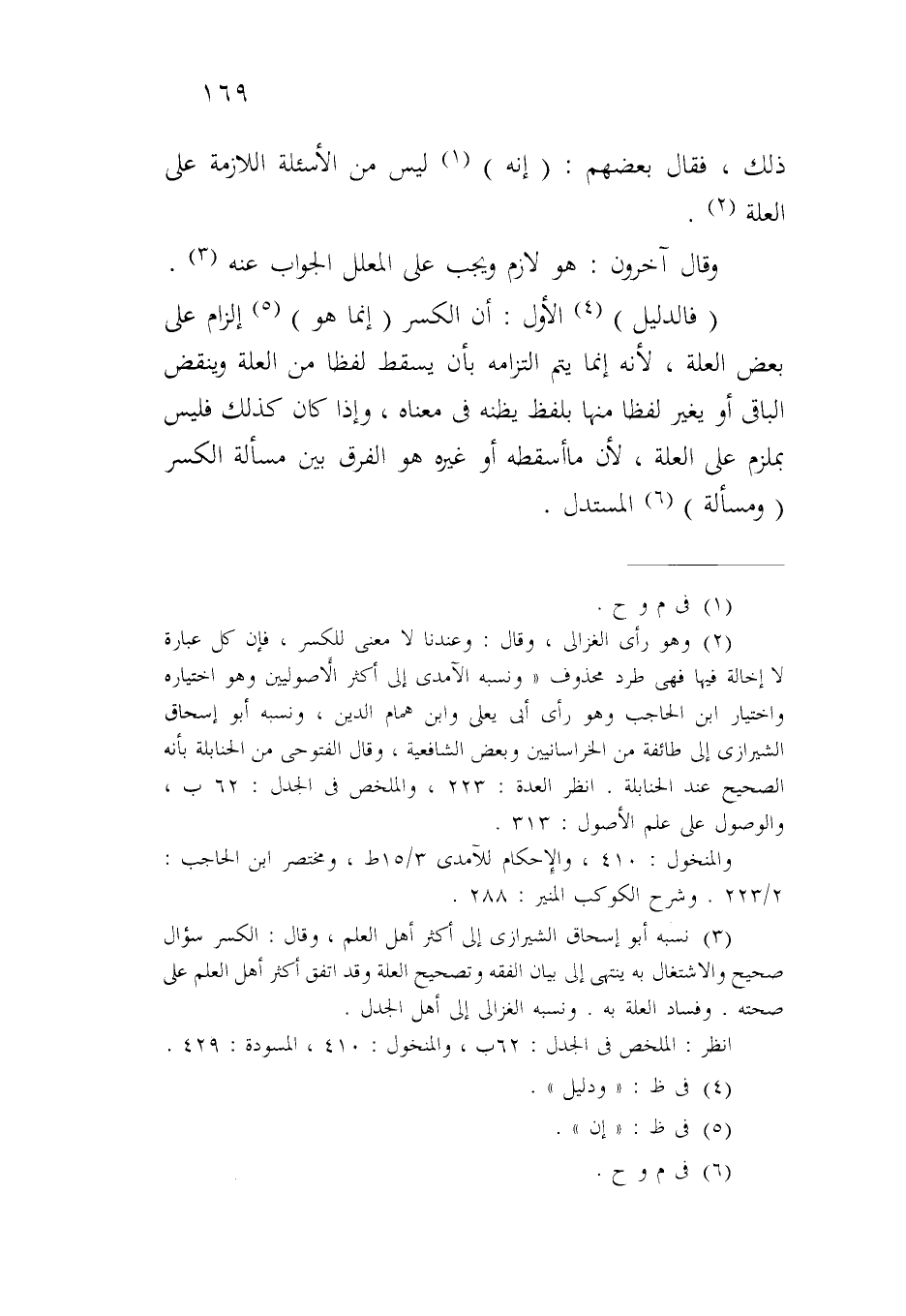 (فالدليل) الأول: أن الكسر (إنما هو) إلزام على بعض العلة، لأنه إنما يتم التزامه بأن يسقط لفظاً من العلة وينقض الباقي أو يغير لفظاً منها بلفظ يظنه في معناه، وإذا كان كذلك فليس بملزم على العلة، لأن ما أسقطه أو غيره هو الفرق بين مسألة الكسر (ومسألة) المستدل.