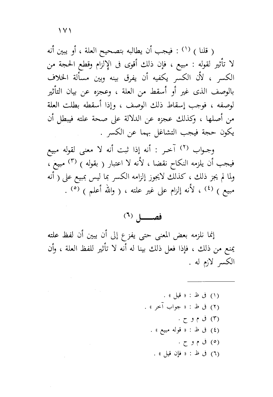 (قلنا): فيجب أن يطالبه بتصحيح العلة، أو يبين أنه لا تأثير لقوله: مبيع، فإن ذلك أقوى في الإلزام وقطع الحجة من الكسر، لأن الكسر يكفيه أن يفرق بينه وبين مسألة الخلاف بالوصف الذي غير أو أسقط من العلة، وعجزه عن بيان التأثير لوصفه، فوجب إسقاط ذلك الوصف، وإذا أسقطه بطلت العلة من أصلها، وكذلك عجزه عن الدلالة على صحة علته فيبطل أن يكون حجة فيجب التشاغل بهما عن الكسر.