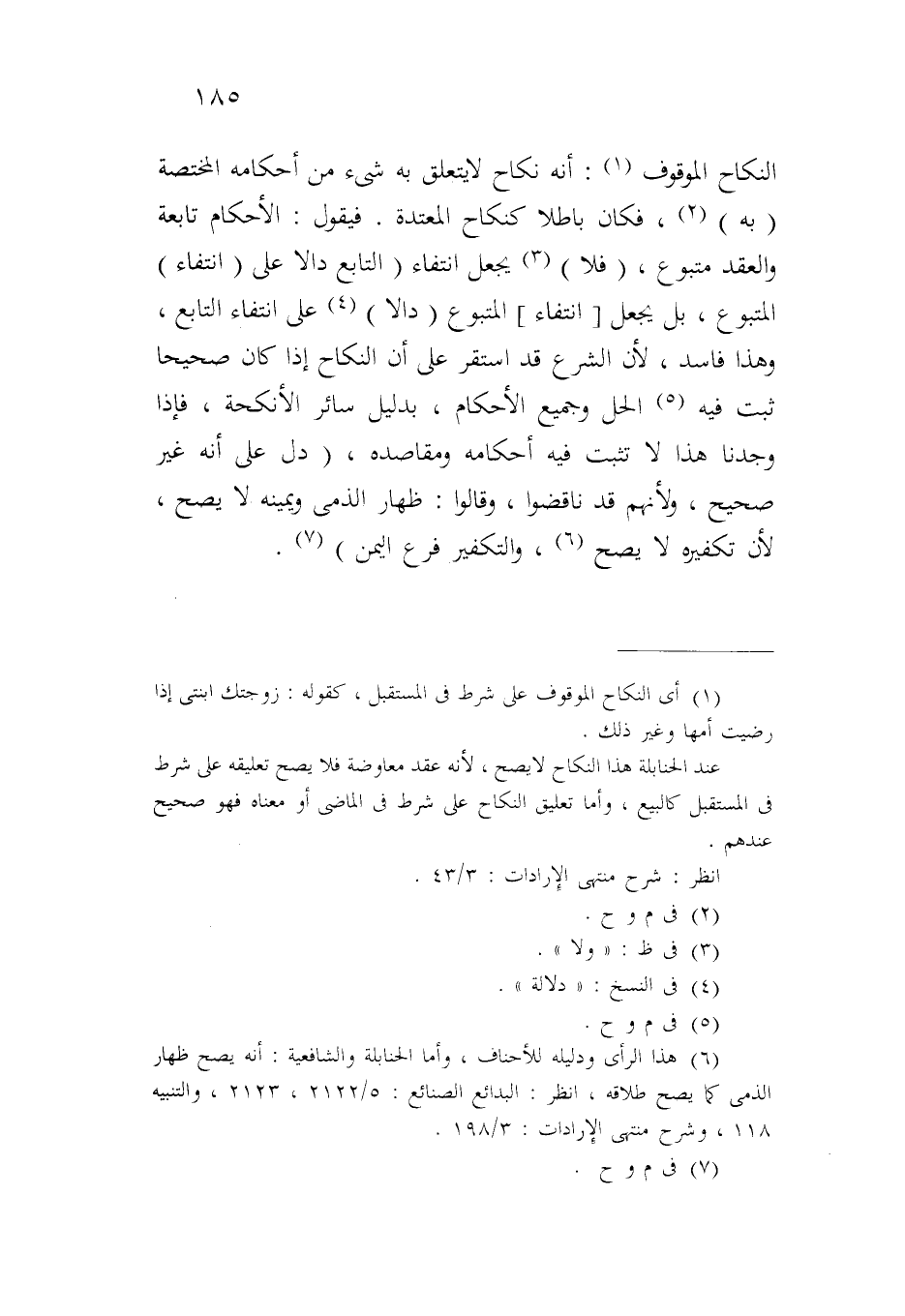 النكاح الموقوف: أنه نكاح لا يتعلق به شيء من أحكامه المختصة (به)، فكان باطلاً كنكاح المعتدة. فيقول: الأحكام تابعة والعقد متبوع، (فلا) يجعل انتفاء (التابع دالاً على (انتفاء) المتبوع، بل يجعل [انتفاء] المتبوع (دالاً) على انتفاع التابع، وهذا فاسد، لأن الشرع قد استقر على أن النكاح إذا كان صحيحاً ثبت فيه الحل وجميع الأحكام، بدليل سائر الأنكحة، فإذا وجدنا هذا لا تثبت فيه أحكامه ومقاصده، (دل على أنه غير صحيح، ولأنهم قد ناقضوا، وقالوا: ظهار الذمي ويمينه لا يصح، لأن تكفيره لا يصح، والتكفير فرع اليمن).