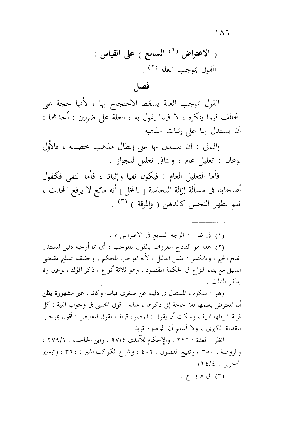 القول بموجب العلة يسقط الاحتجاج بها، لأنها حجة على المخالف فيما ينكره، لا فيما يقول به، العلة على ضربين: أحدهما: أن يستدل بها على إثبات مذهبه.