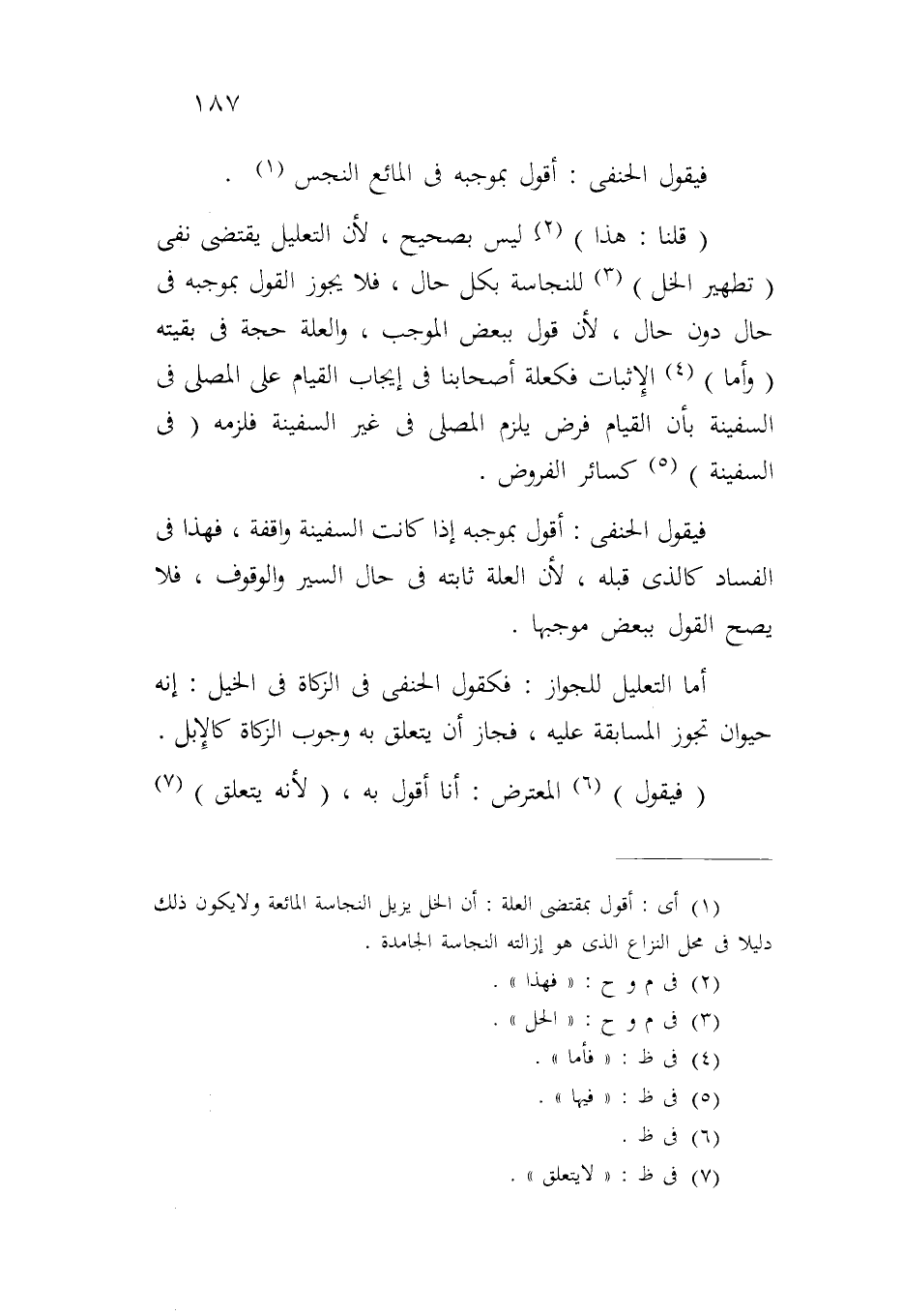 (قلنا: هذا) ليس بصحيح، لأن التعليل يقتضي نفي (تطهير الخل) للنجاسة بكل حال، فلا يجوز القول بموجبه في حال دون حال، لأن قول ببعض الموجب، والعلة حجة في بقيته (وأما) الإثبات فكعلة أصحابنا في إيجاب القيام على المصلي في السفينة بأن القيام فرض يلزم المصلي في غير السفينة فلزمه (في السفينة) كسائر الفروض.