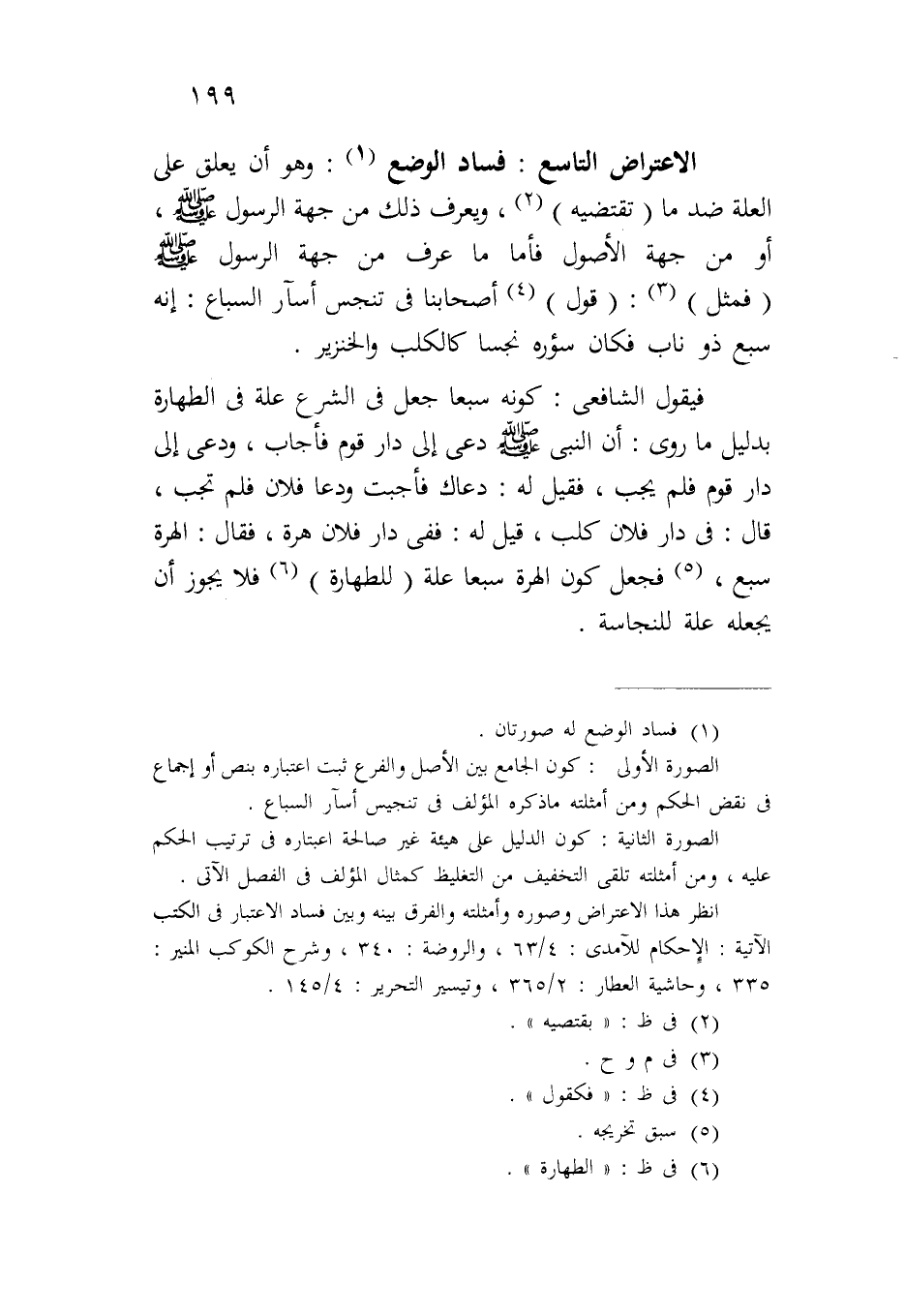 الاعتراض التاسع: فساد الوضع: وهو أن يعلق على العلة ضد ما (تقتضيه)، ويعرف ذلك من جهة الرسول صلى الله عليه وسلم، أو من جهة الأصول فأما ما عرف من جهة الرسول صلى الله عليه وسلم (فمثل): (قول) أصحابنا في تنجس أسآر السباع: إنه سبع ذو ناب فكان سؤره نجساً كالكلب والخنزير.