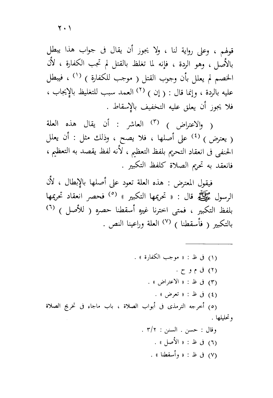 فيقول المعترض: هذه العلة تعود على أصلها بالإبطال، لأن الرسول صلى الله عليه وسلم قال: "تحريمها التكبير" فحصر انعقاد تحريمها بلفظ التكبير، فمتى اخترنا غيره أسقطنا حصره (للأصل) بالتكبير (فأسقطنا) العلة وراعينا النص.